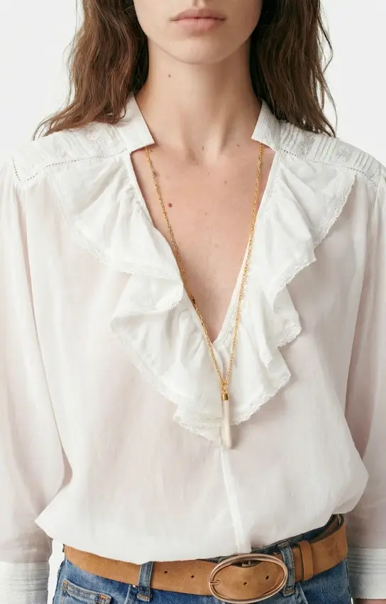 L’élégance romantique atteint son apogée avec la blouse Grenet blanc de Vanessa Bruno. Elle est disponible chez Concept 102 et ce modèle fascine par son col montant richement travaillé et ses jeux de dentelles géométriques. Sa coupe structurée, ponctuée de volants délicats, offre une allure à la fois magistrale et légère, parfaite pour celles qui recherchent une pièce forte au caractère intemporel à Granville.