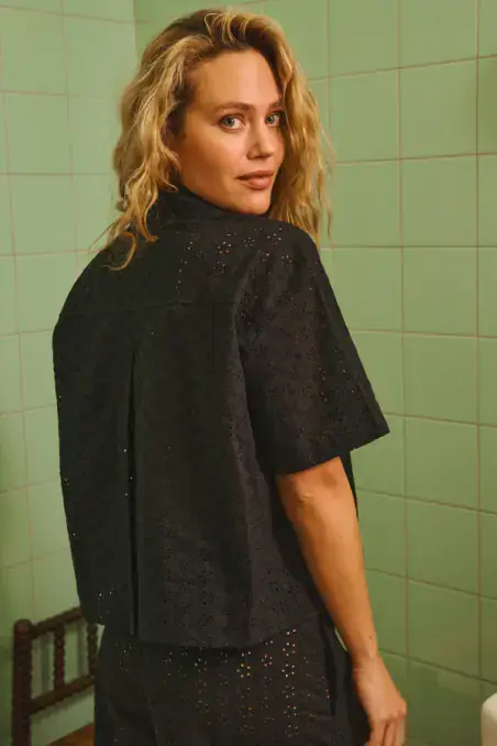 « La chemise Claudio, c’est pour moi la définition même de la ‘belle pièce’ que l’on garde des années. Rue Couraye, elle fait l’unanimité car elle réinterprète un classique avec beaucoup de modernité. Ce que j’adore, c’est la finesse de la broderie qui laisse deviner la peau (ou une jolie lingerie comme le Top Ambre) sans jamais trop en montrer. Elle a un tombé impeccable qui flatte la silhouette sans la contraindre. Je la conseille souvent rentrée dans un jean brut pour un look décontracté chic, ou ouverte sur un maillot de bain pour une allure Riviera irrésistible à Granville. »