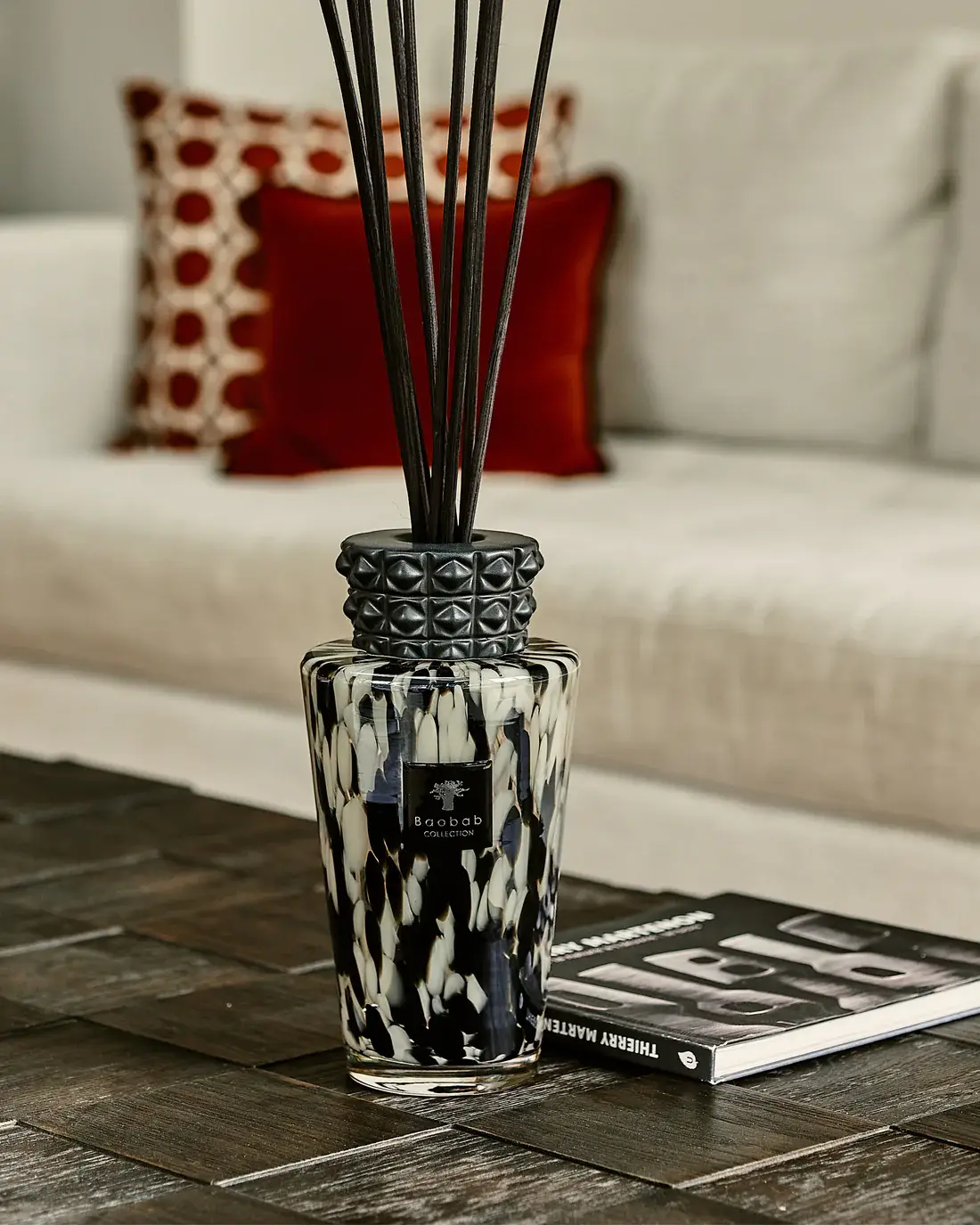Le Totem Black Pearls 2L est bien plus qu’un simple diffuseur ; c’est un hommage au savoir-faire verrier. Chez Concept 102, nous apprécions particulièrement l’aspect organique de ce flacon. Le verre, soufflé de manière artisanale, présente des variations de motifs qui garantissent que chaque Totem est une œuvre d’art singulière. Son format généreux de 2 litres assure une diffusion par capillarité pendant de longs mois, parfumant les volumes les plus vastes avec une constance remarquable.