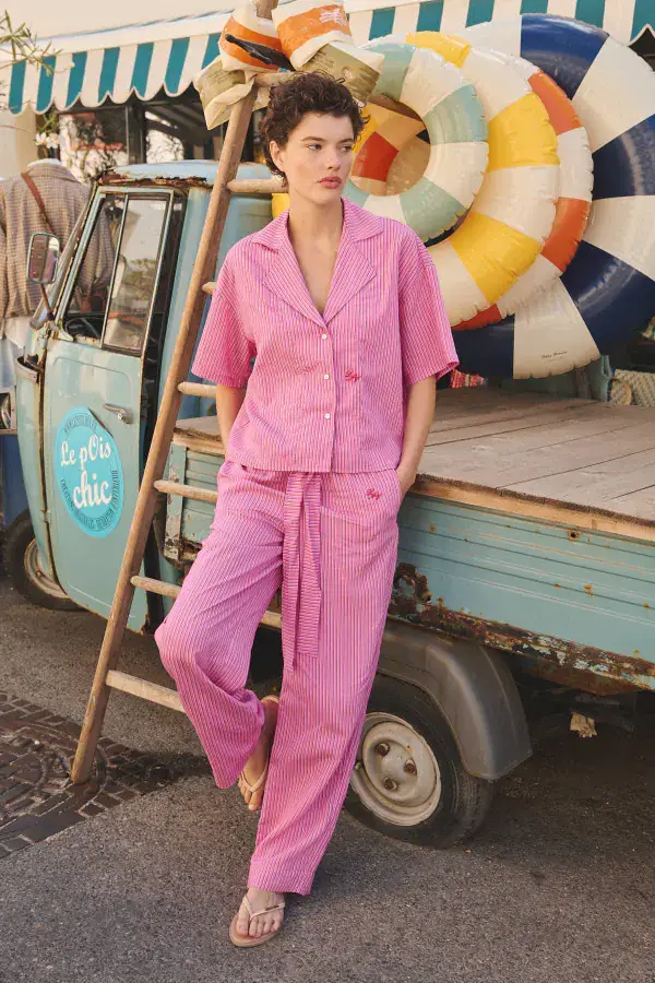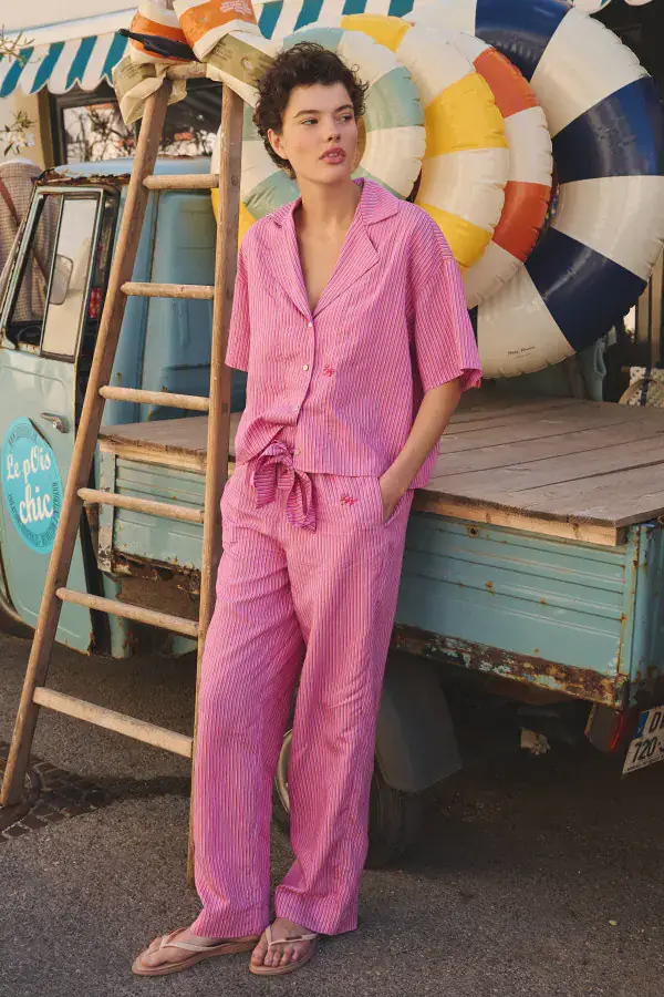 « Le Pantalon Tom, c’est pour moi la définition même du chic sans effort. Rue Couraye, il séduit par sa polyvalence : il est aussi parfait porté sur un maillot de bain pour une balade à Chausey que pour un dîner décontracté en ville. Ce que j’adore dans l’imprimé Beachwear Stripes, c’est cette fraîcheur intemporelle qui rappelle les cabines de plage emblématiques. Sa matière légère glisse sur la peau, offrant une sensation de fraîcheur incroyable. Je conseille souvent de le porter avec un débardeur ajusté ou le Top Ambre pour équilibrer les volumes et créer une silhouette longiligne et moderne. »