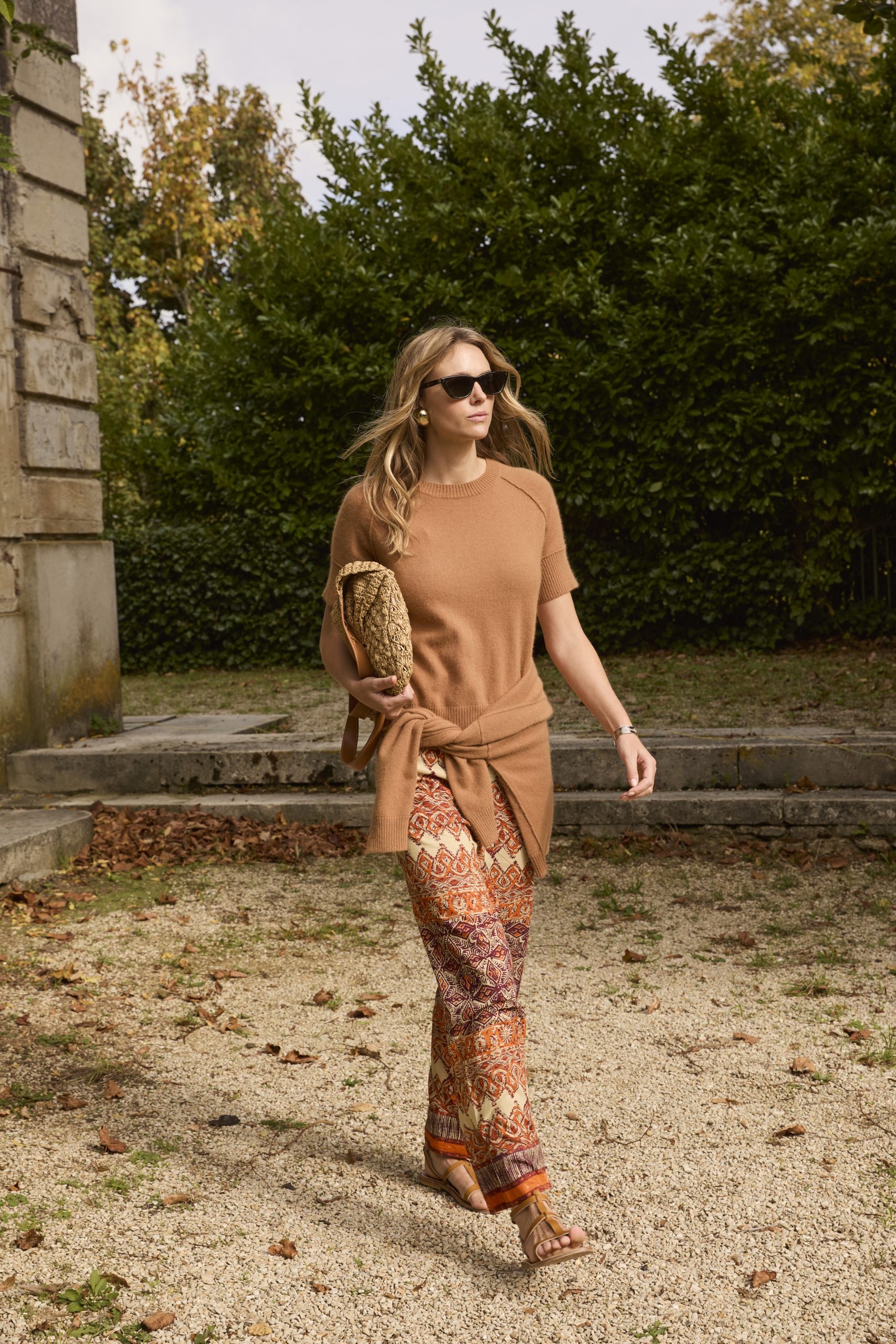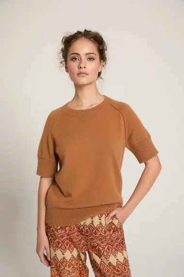« Ce coloris Praline est une petite merveille : il réchauffe le teint instantanément et s’éloigne des beiges classiques avec beaucoup de caractère. J’ai choisi ce modèle pour le travail de sa maille qui a un relief incroyable, presque artisanal. C’est le pull doudou mais élégant que l’on glisse sur les épaules au coucher du soleil. Il est parfait pour structurer une tenue fluide tout en restant dans une palette de couleurs naturelles et minérales. »