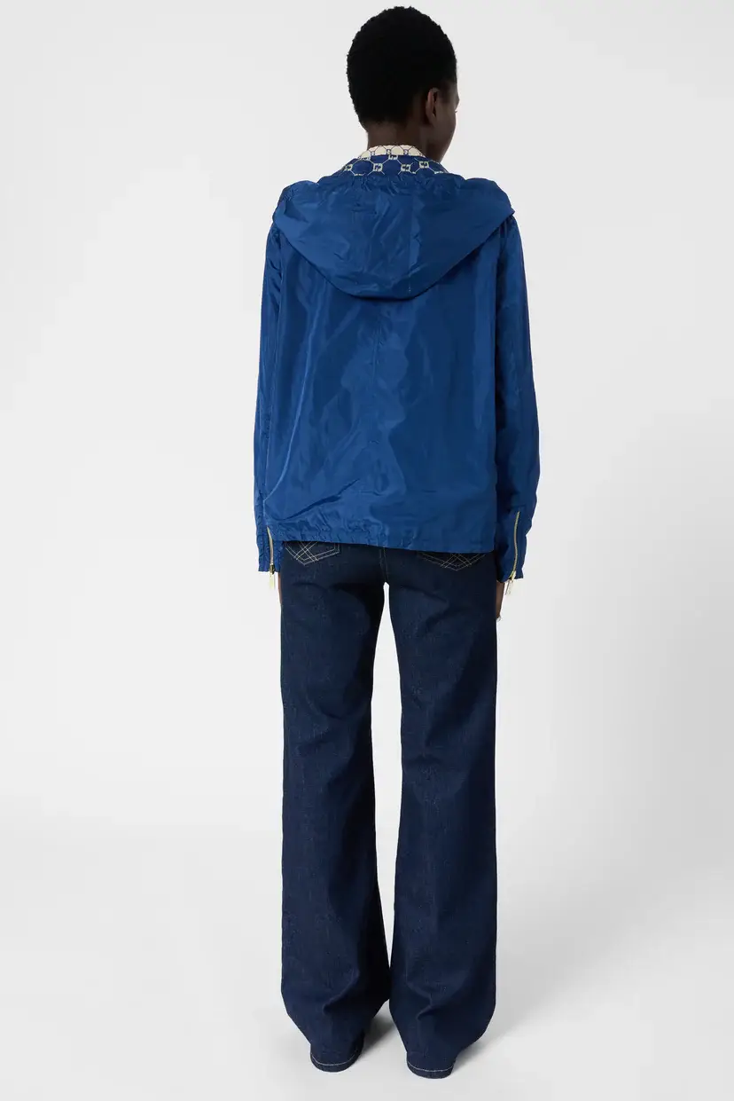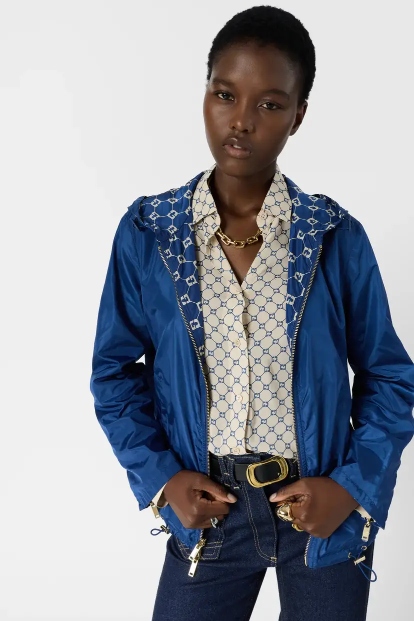 Doté d’une coupe droite modulable, le trench Juline s’ajuste à votre convenance grâce à ses liens de serrage avec stoppeurs à la taille. Ses zips dorés apportent une touche de lumière luxueuse qui contraste élégamment avec son motif géométrique monogrammé écru sur fond marine. Sa capuche intégrée et ses poignets zippés en font une pièce aussi fonctionnelle qu’esthétique.
