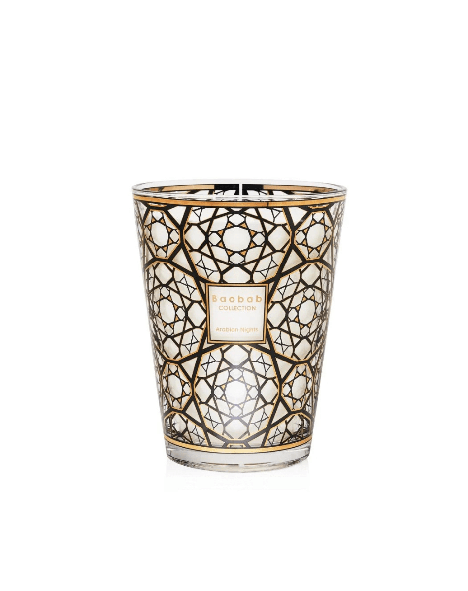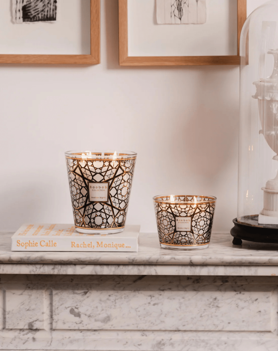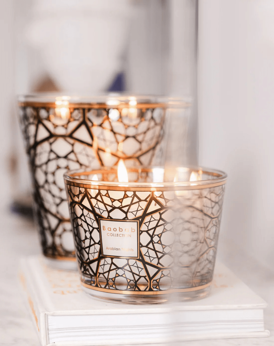 La bougie parfumée Arabian Nights nous transporte au cœur du Moyen-Orient. Son verre, sérigraphié à l’or 24 carats, s’inspire du célèbre moucharabieh et de ses motifs ajourés typiques de l’architecture arabe. La flamme qui scintille derrière ce décor projette des ombres enveloppantes, créant une ambiance mystérieuse et captivante.