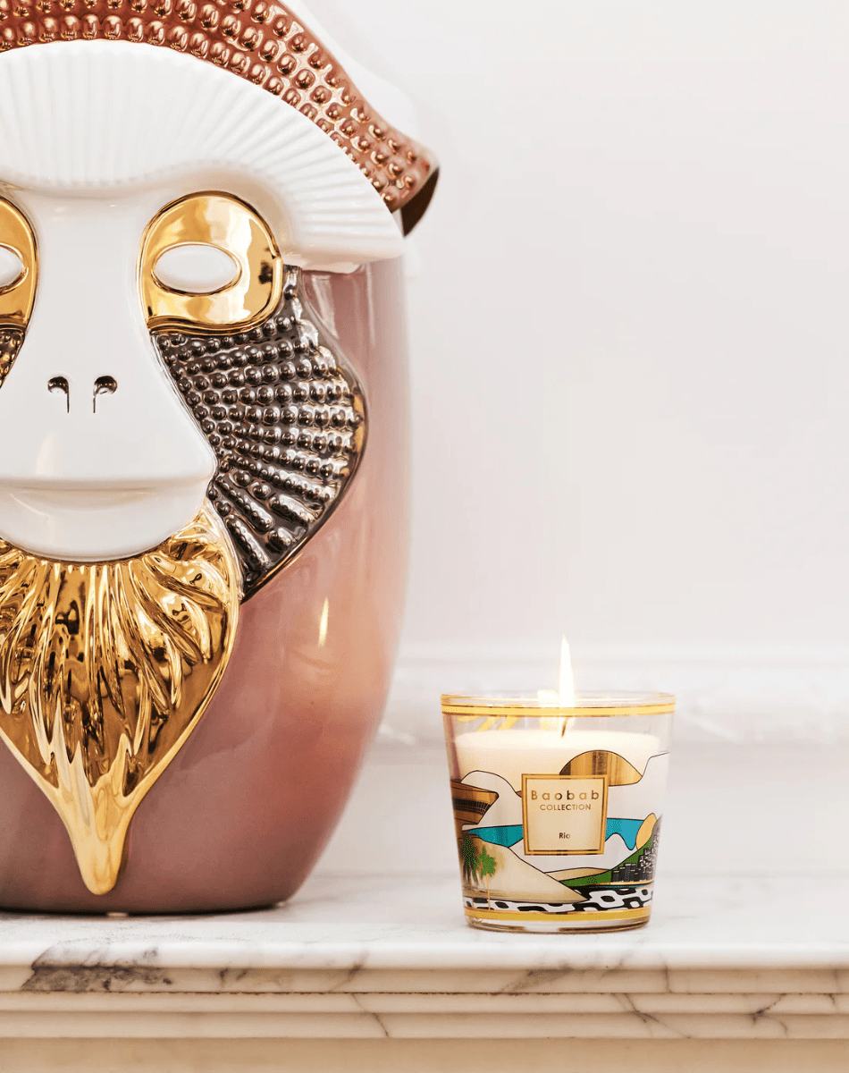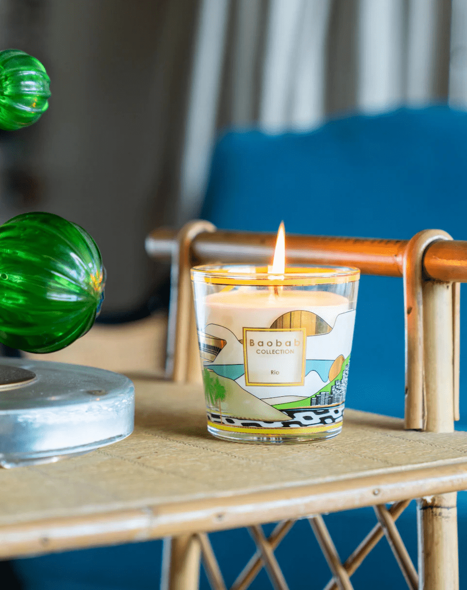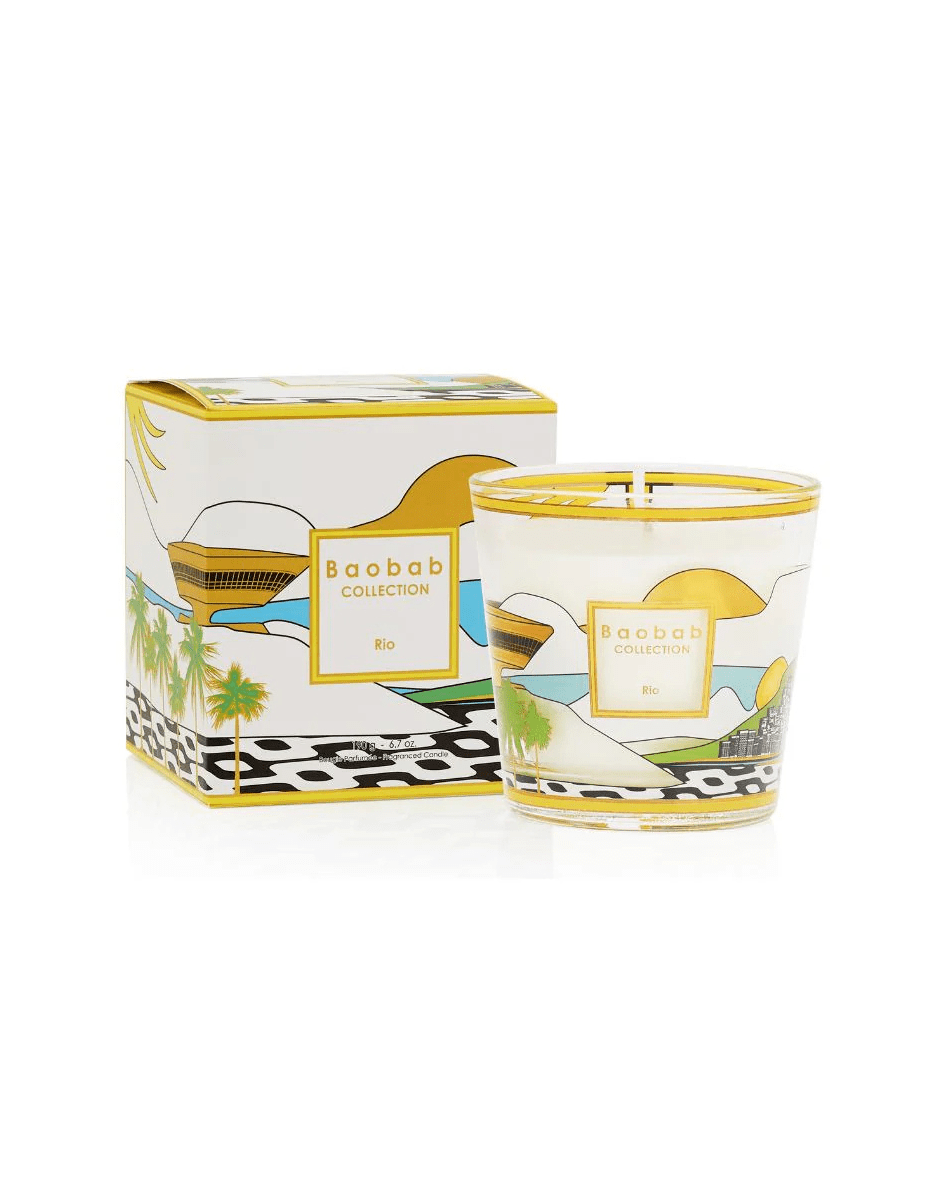La bougie parfumée Rio se pare d’une sérigraphie dorée et colorée, inspirée de l’architecture emblématique de la ville. On y distingue le musée d’art contemporain de Niterói, conçu par Oscar Niemeyer, les pavés qui bordent la plage d’Ipanema et un horizon délicat avec un fragment du Pain de Sucre. Son parfum de bergamote, de thé vert et de musc évoque la chaleur et l’énergie envoûtante de cette métropole tropicale.