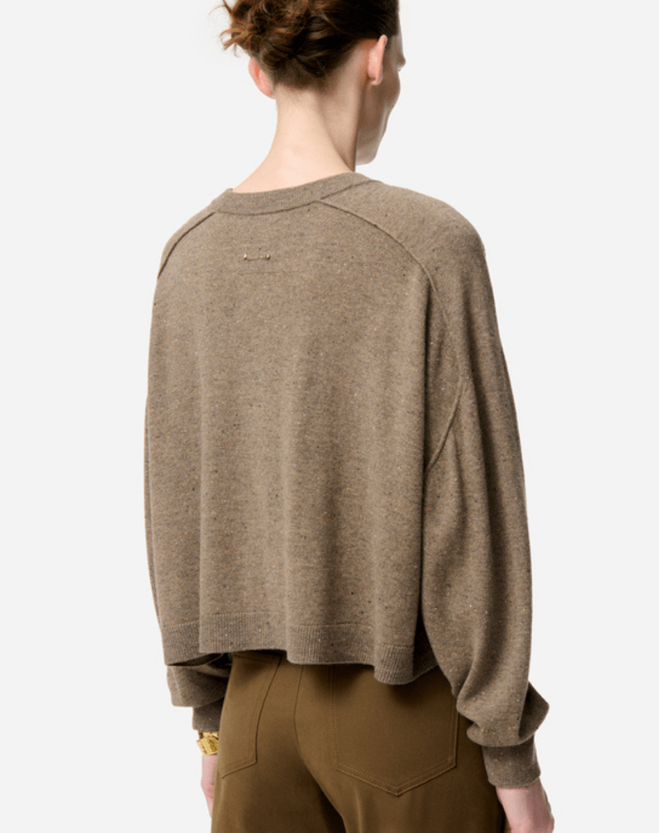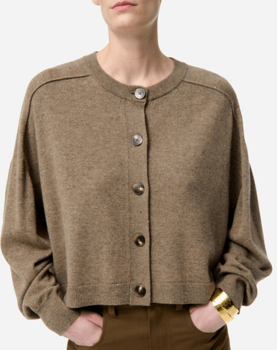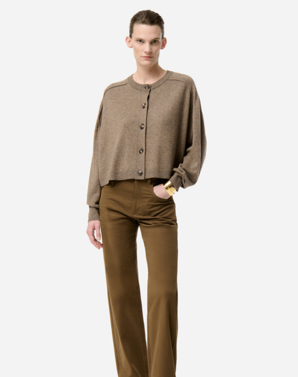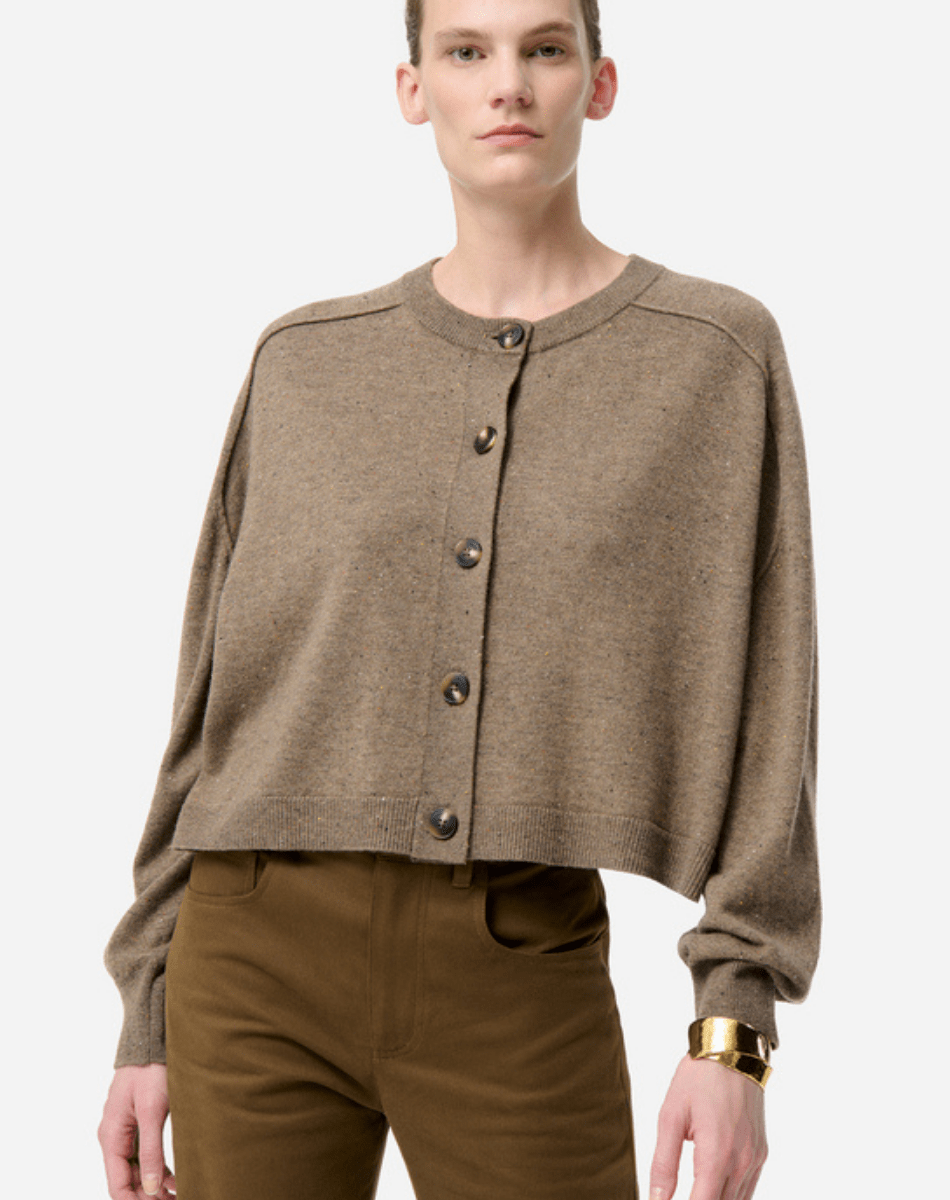 Un gilet court et raffiné, sublimé par de délicats boutons qui lui confèrent un charme rétro.
