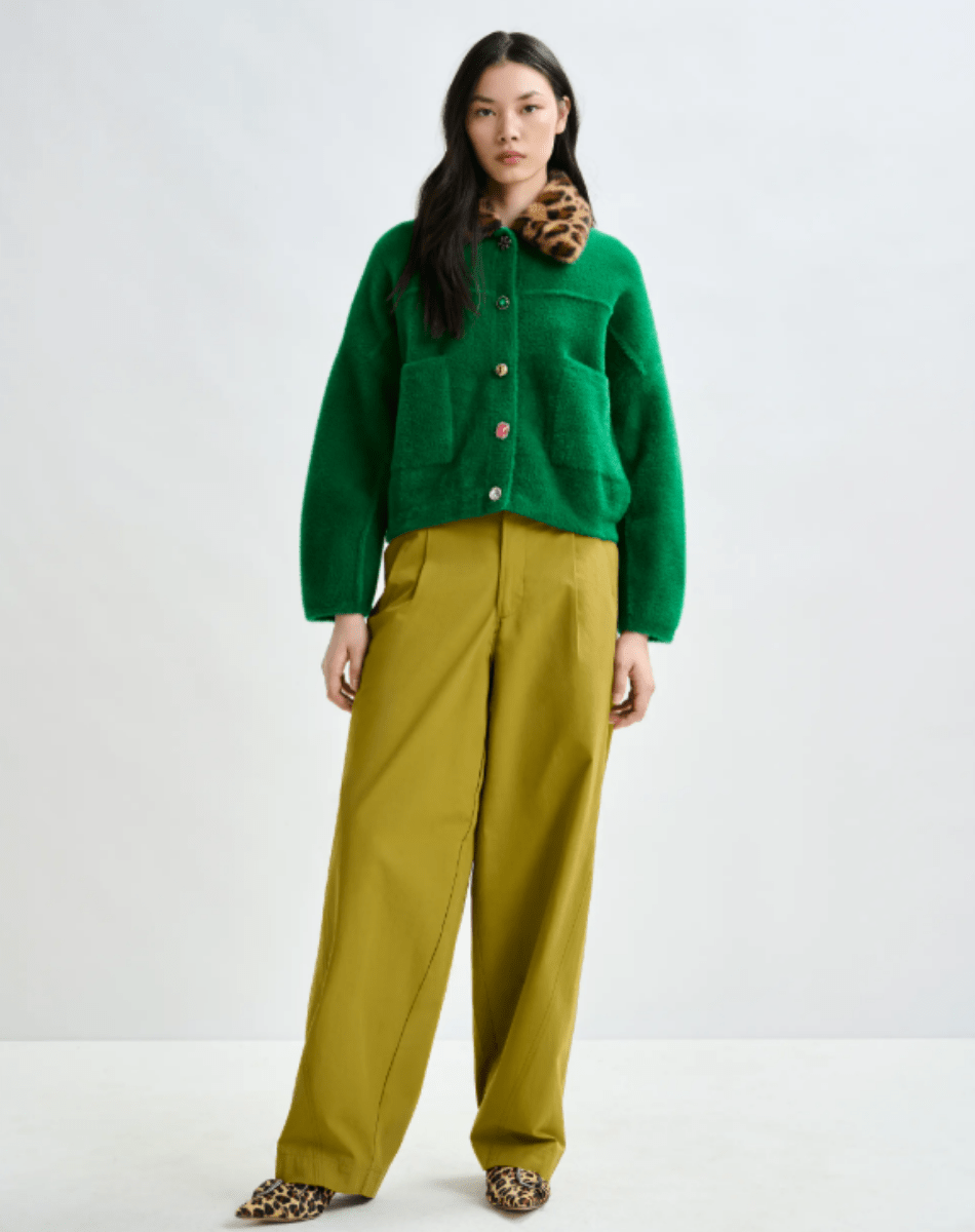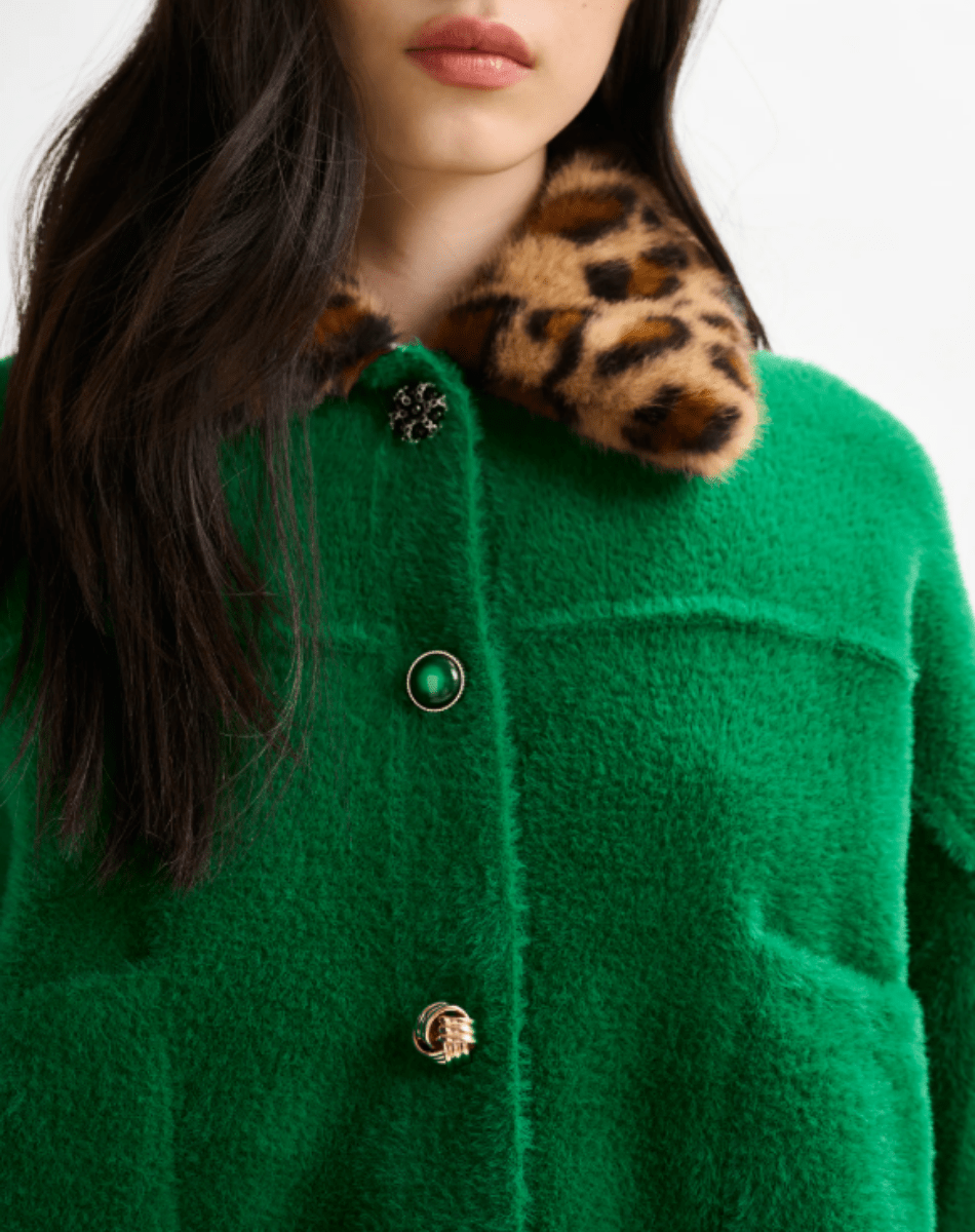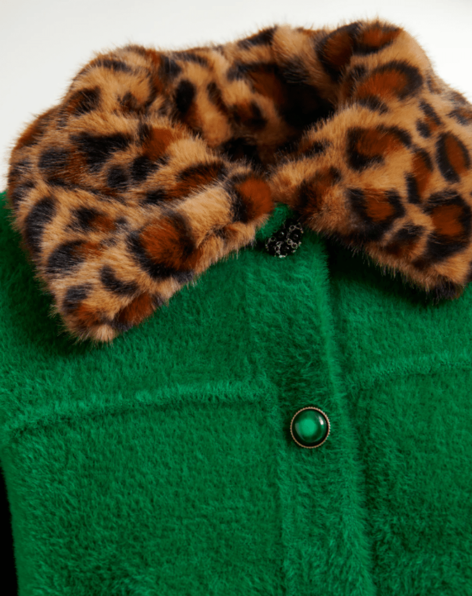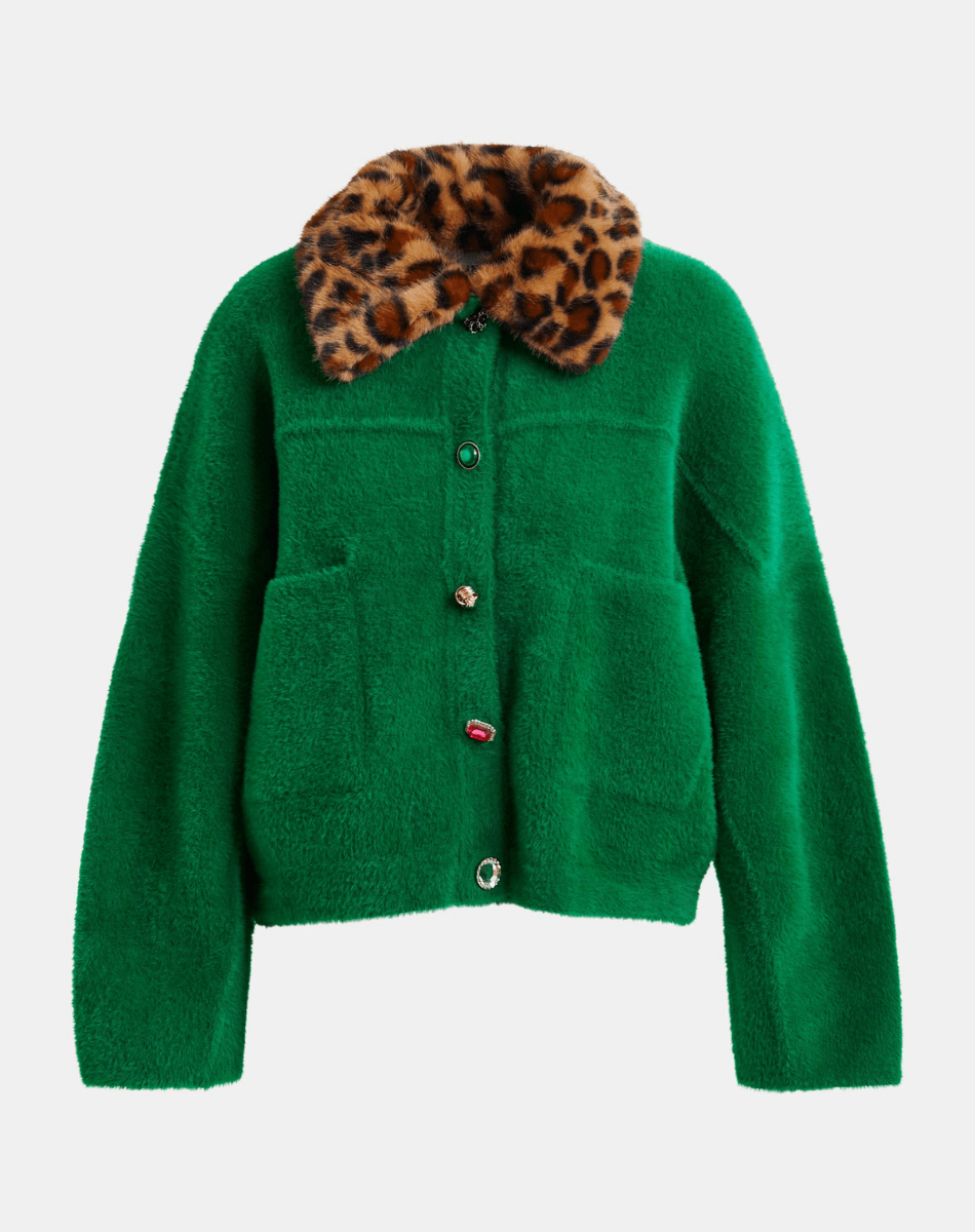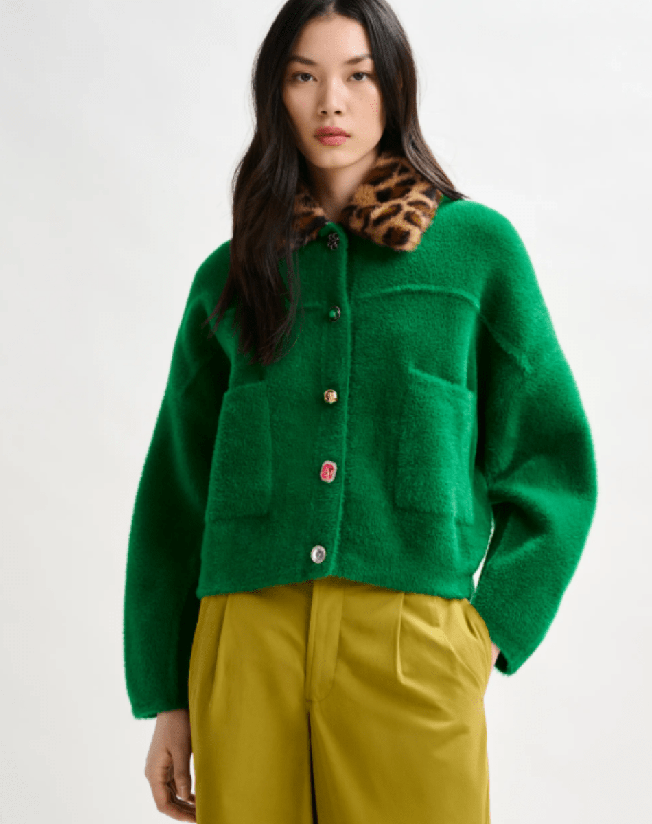 Cardigan au style affirmé, pensé dans une coupe décontractée. Il se distingue par son jeu de boutons décalés et ses deux poches plaquées pratiques. Cette maille combine avec aisance originalité et confort au quotidien. Sa particularité ? Un col amovible en fausse fourrure à motif léopard, qui permet de transformer le look instantanément. Idéal porté seul ou en superposition.