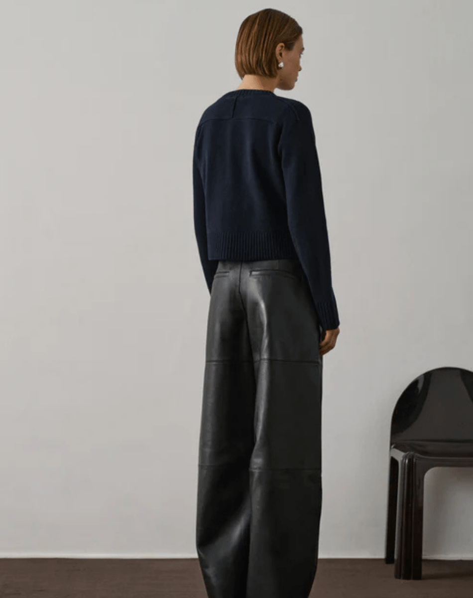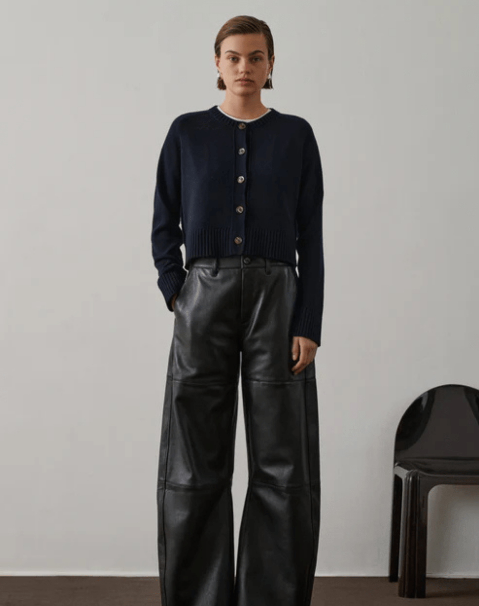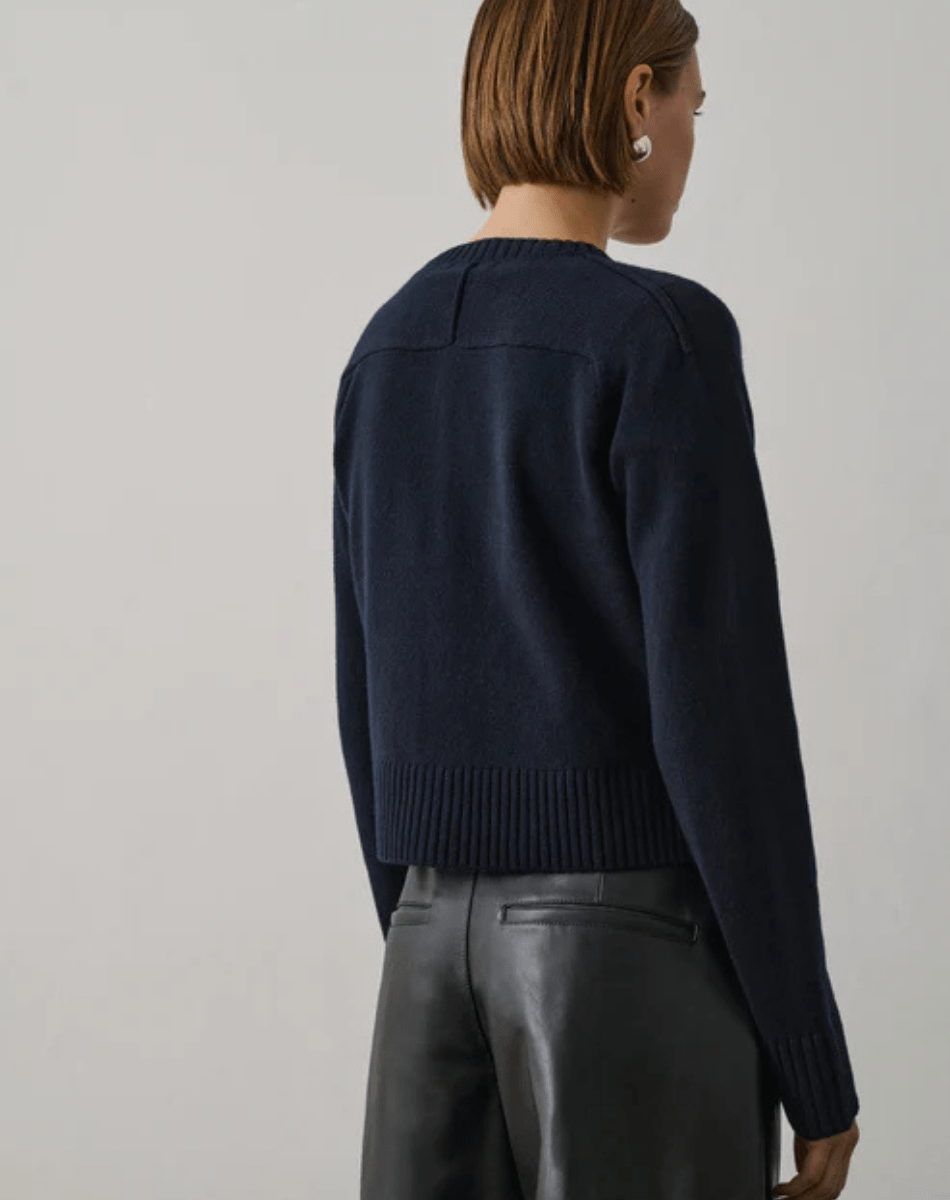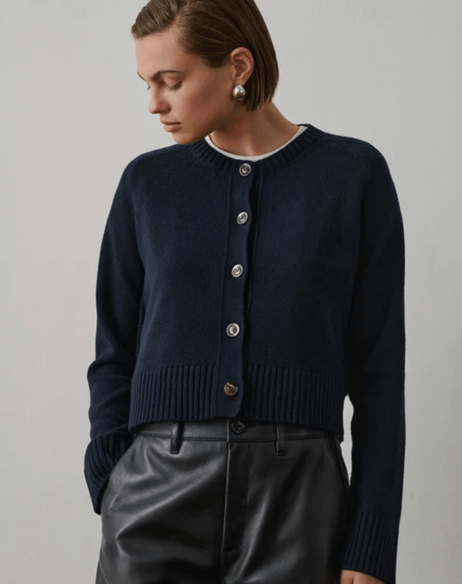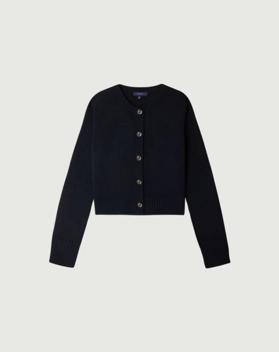 Le cardigan Virginia est un modèle court en laine mérinos 100 %, offrant une coupe ajustée avec des manches longues et un col rond. Il se distingue par sa fermeture boutonnée sur le devant et des détails de coutures aux épaules, apportant une touche de structure à sa silhouette fluide.