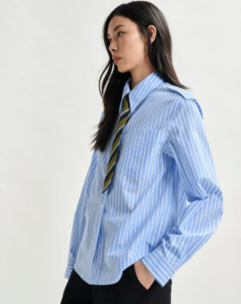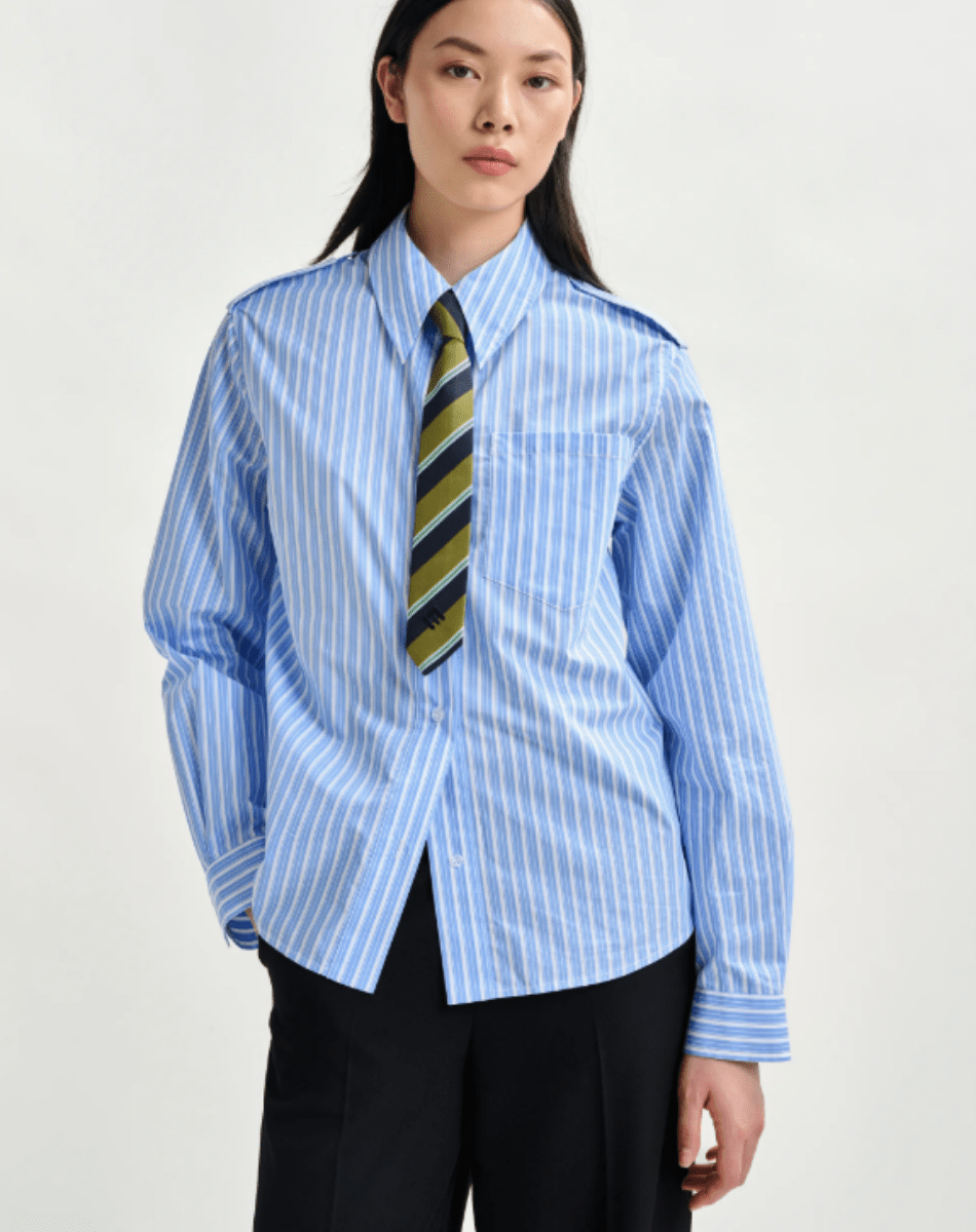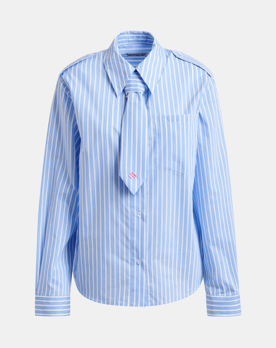 Chemise à coupe boxy, revisite ludique du grand classique. Confectionnée dans un coton mélangé, elle se distingue par ses emmanchures basses et son ourlet légèrement arrondi. Une poche poitrine et une fermeture boutonnée signent son esprit intemporel, tandis que la cravate amovible lui apporte une note de charme. Les pattes d’épaules boutonnées ajoutent une touche utilitaire subtile, accentuant son allure décontractée et sophistiquée. Portée rentrée, fluide ou superposée, cette chemise conjugue polyvalence et élégance.
