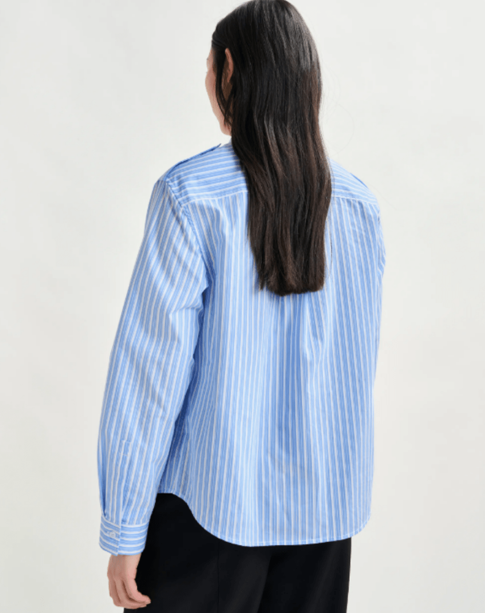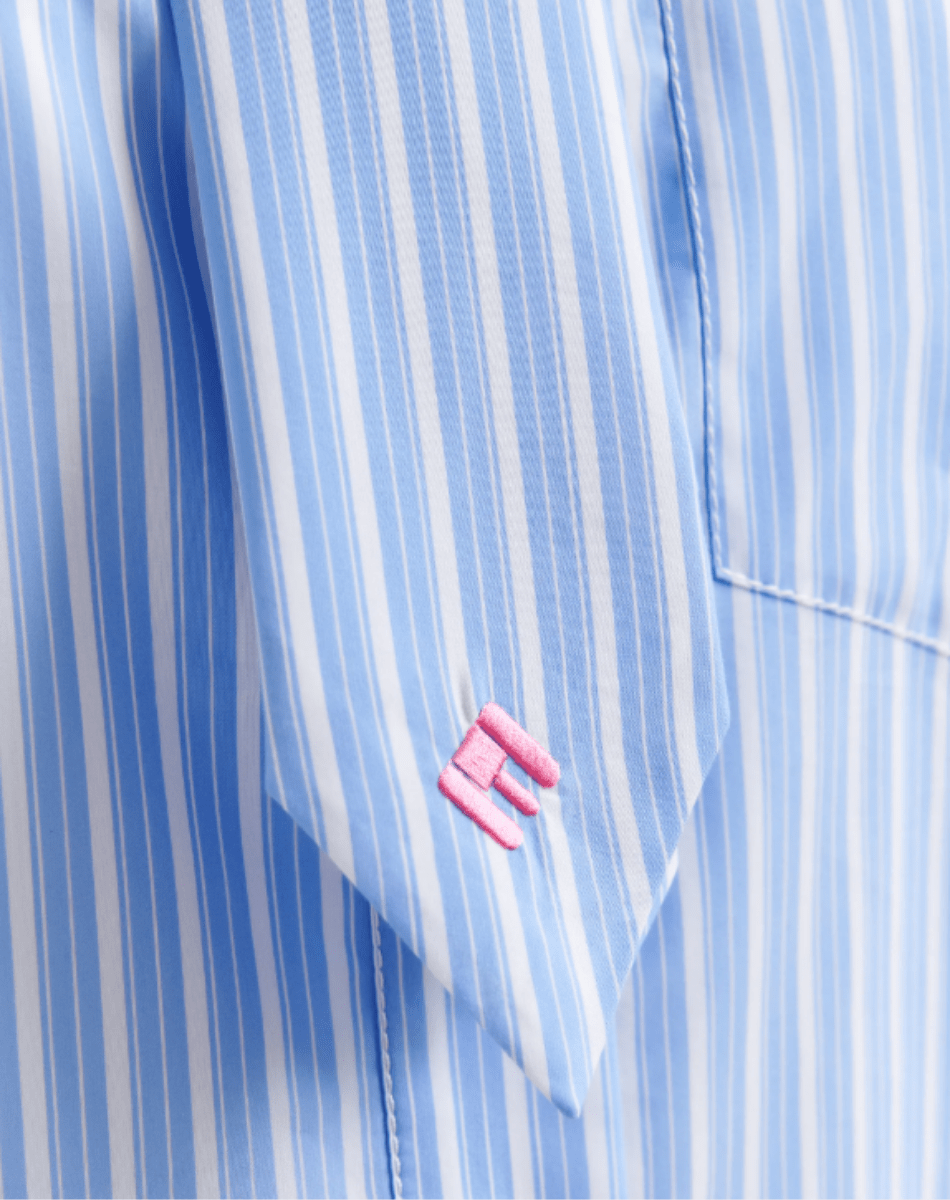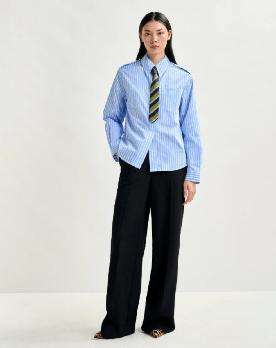 Chemise à coupe boxy, revisite ludique du grand classique. Confectionnée dans un coton mélangé, elle se distingue par ses emmanchures basses et son ourlet légèrement arrondi. Une poche poitrine et une fermeture boutonnée signent son esprit intemporel, tandis que la cravate amovible lui apporte une note de charme. Les pattes d’épaules boutonnées ajoutent une touche utilitaire subtile, accentuant son allure décontractée et sophistiquée. Portée rentrée, fluide ou superposée, cette chemise conjugue polyvalence et élégance.