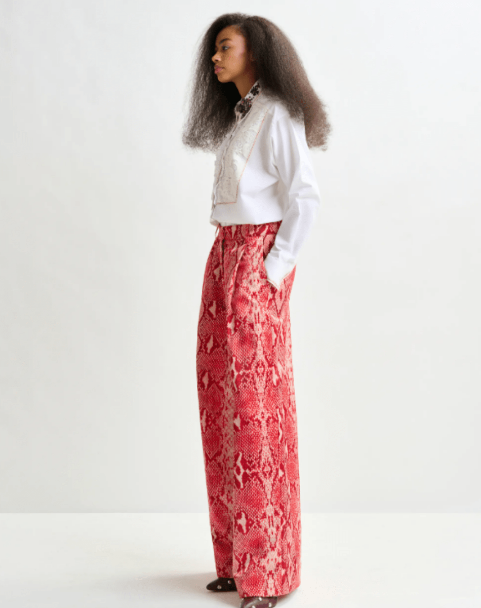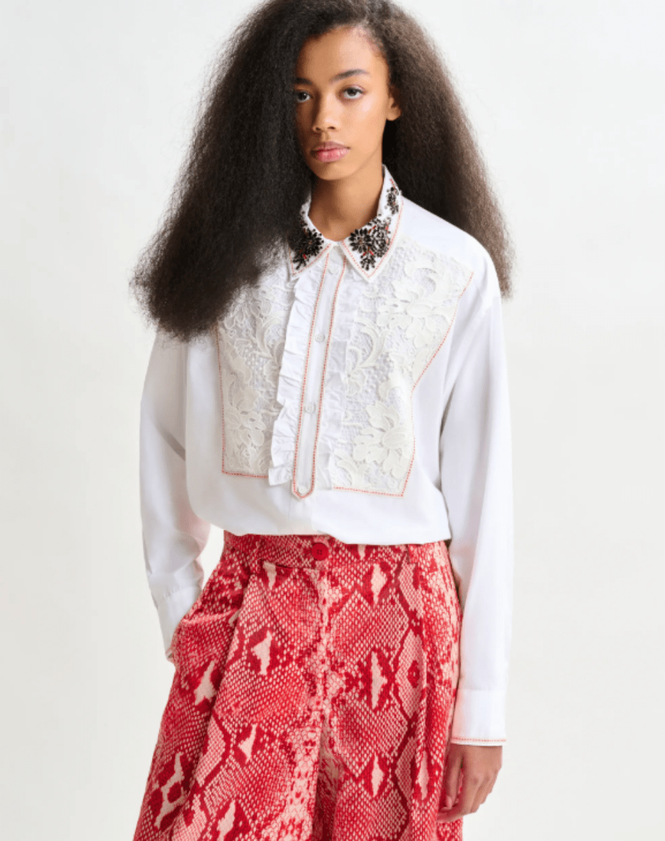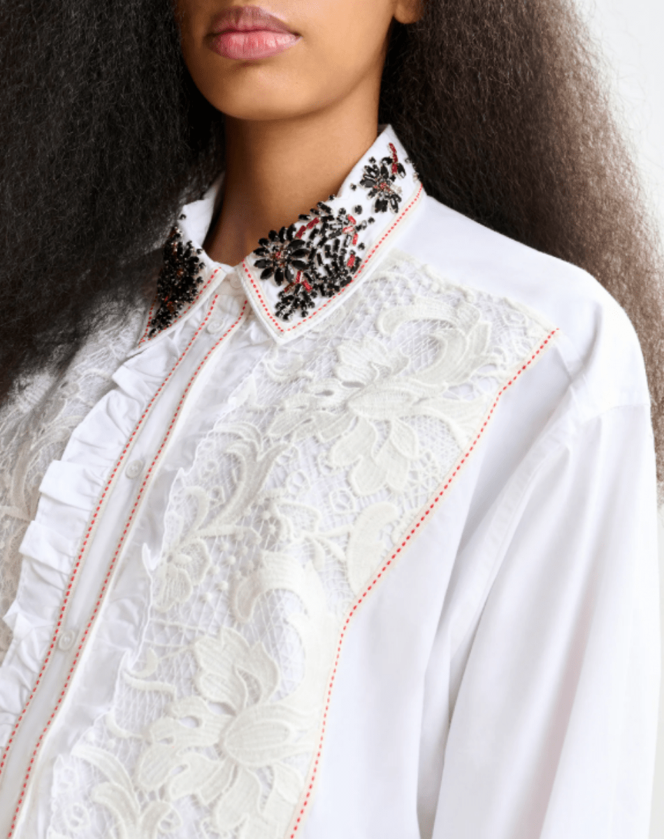 Chemisier oversize en popeline de coton, enrichi de détails raffinés. Il se distingue par un empiècement en dentelle délicat à l’avant et des volants unis qui lui apportent une touche féminine, tandis que le col est sublimé par des broderies florales sophistiquées. Les emmanchures basses et les manches longues et volumineuses sont accentuées par des poignets aux coutures contrastées discrètes. L’ourlet arrondi, plus long à l’arrière, permet de porter la chemise rentrée ou en superposition. Fermeture boutonnée sur le devant pour un fini élégant.