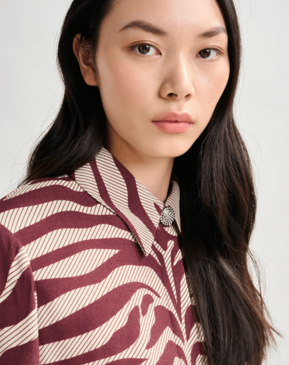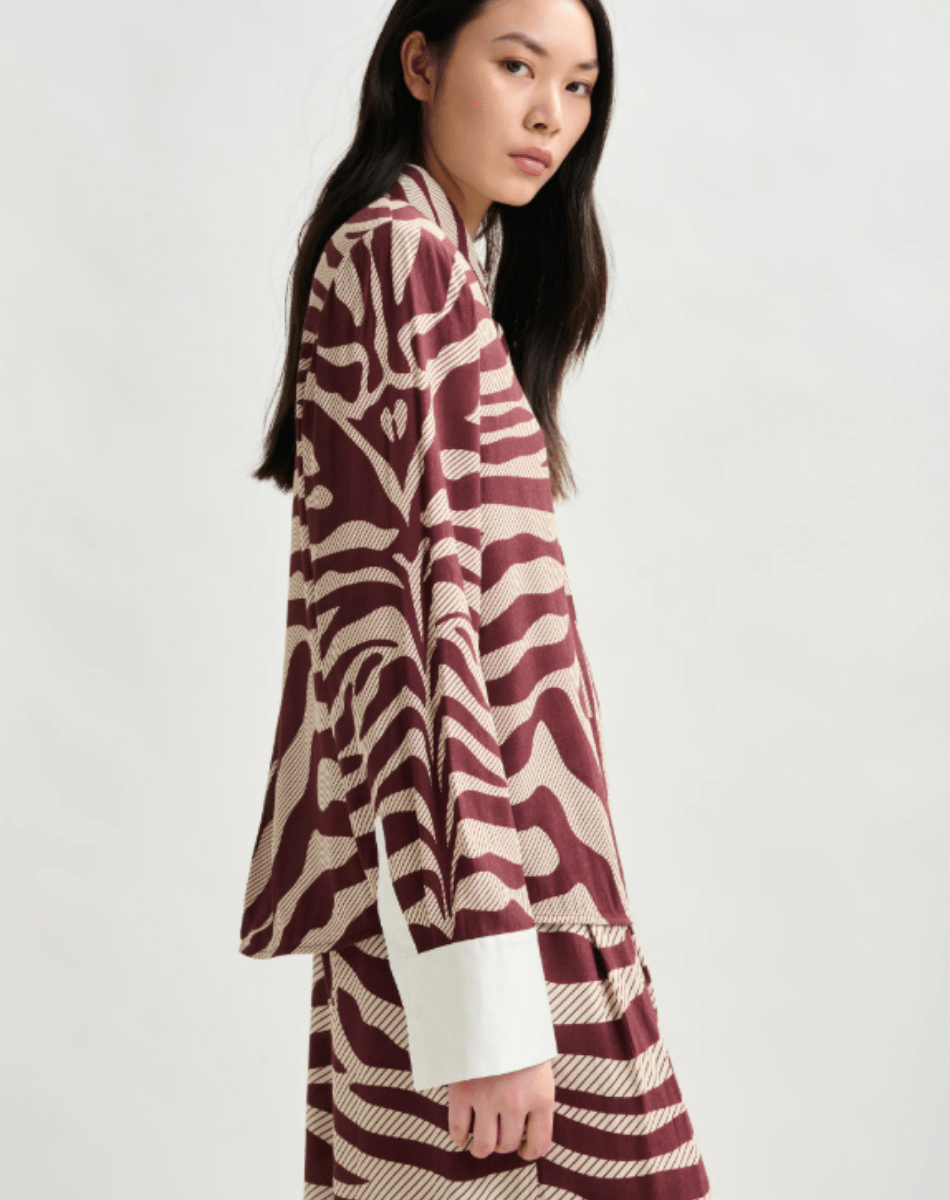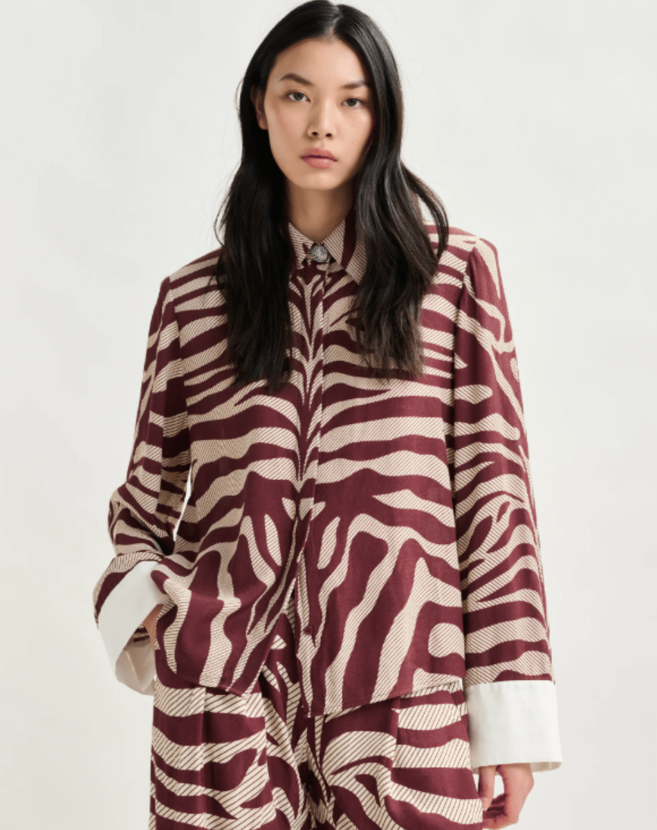 Chemise oversize mêlant structure et fluidité, sublimée par des épaulettes amovibles qui permettent de moduler la silhouette à volonté. Sa patte minimaliste est rehaussée d’un unique bouton en strass au col, détail raffiné qui attire le regard. Confectionnée dans un jacquard à motif zèbre, elle présente un ourlet arrondi offrant une grande liberté de style, qu’elle soit portée rentrée ou laissée fluide.
