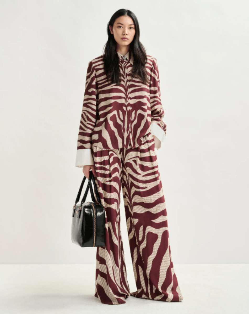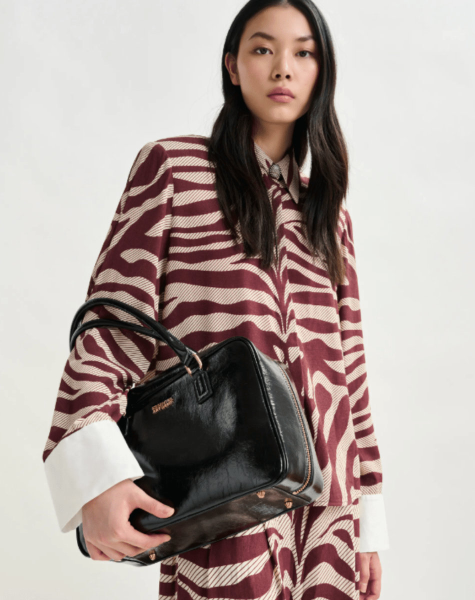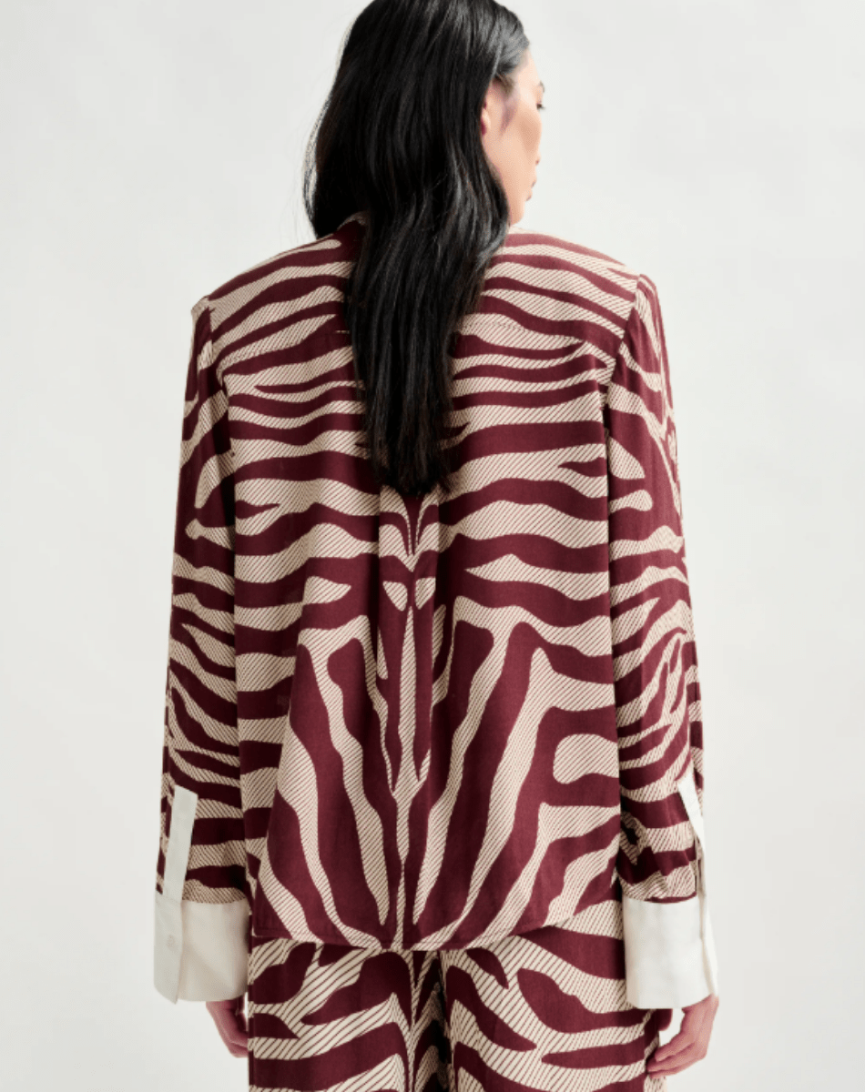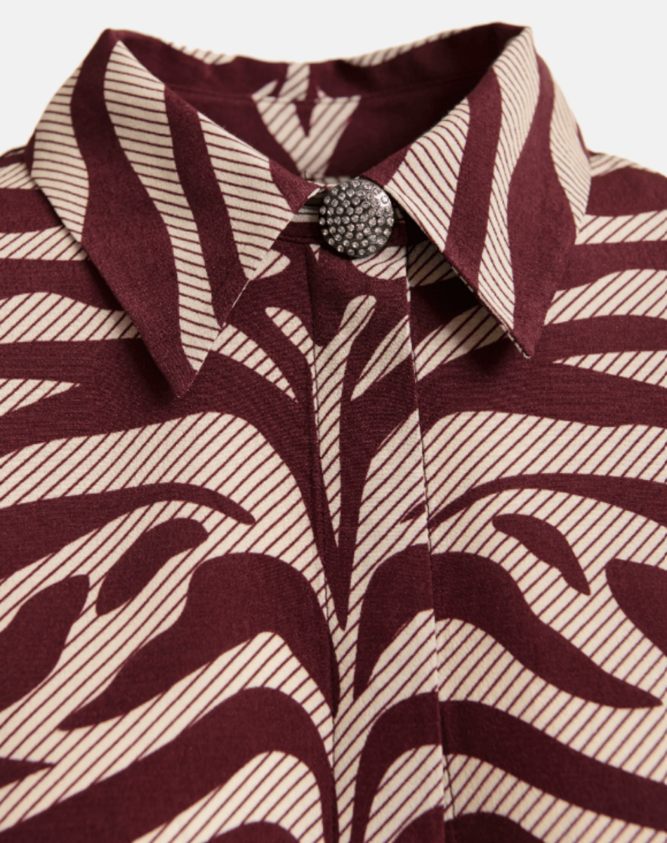 Chemise oversize mêlant structure et fluidité, sublimée par des épaulettes amovibles qui permettent de moduler la silhouette à volonté. Sa patte minimaliste est rehaussée d’un unique bouton en strass au col, détail raffiné qui attire le regard. Confectionnée dans un jacquard à motif zèbre, elle présente un ourlet arrondi offrant une grande liberté de style, qu’elle soit portée rentrée ou laissée fluide.