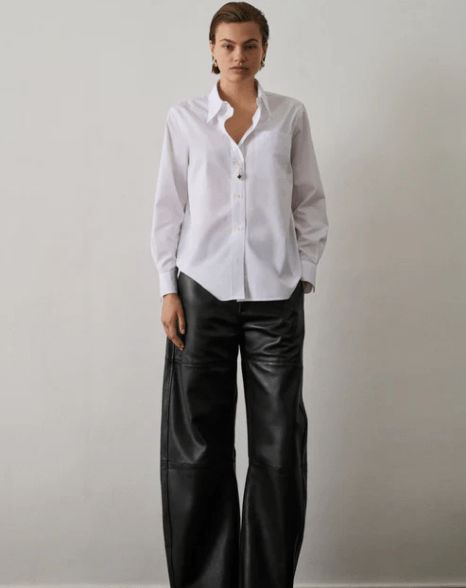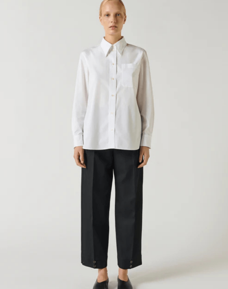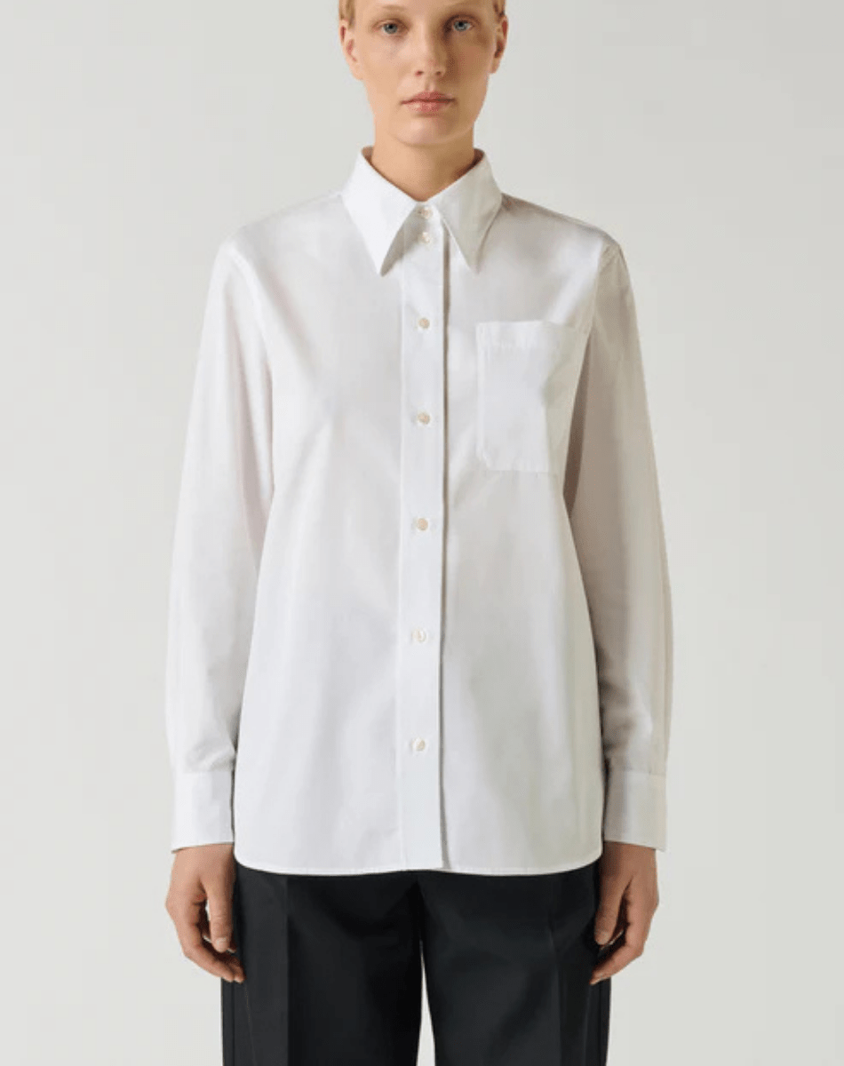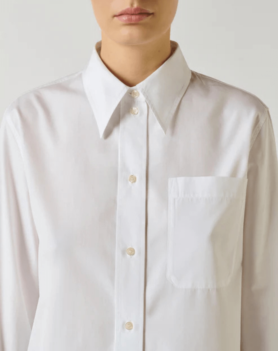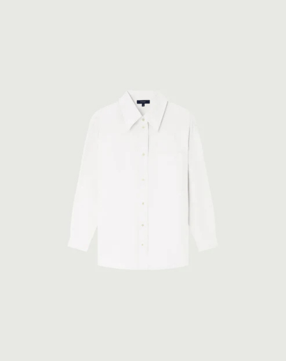 La chemise Saphir est une pièce intemporelle en popeline de coton biologique, offrant une coupe droite et ample. Elle se distingue par son col chemise, sa patte de boutonnage sur le devant, ses manches longues avec poignets boutonnés, une poche poitrine plaquée et un bas de chemise en forme liquette.