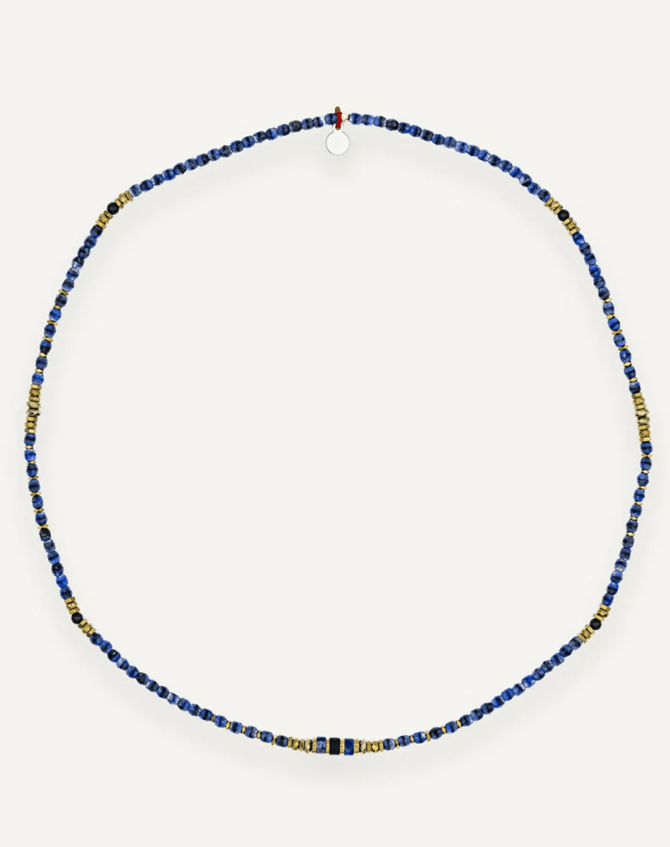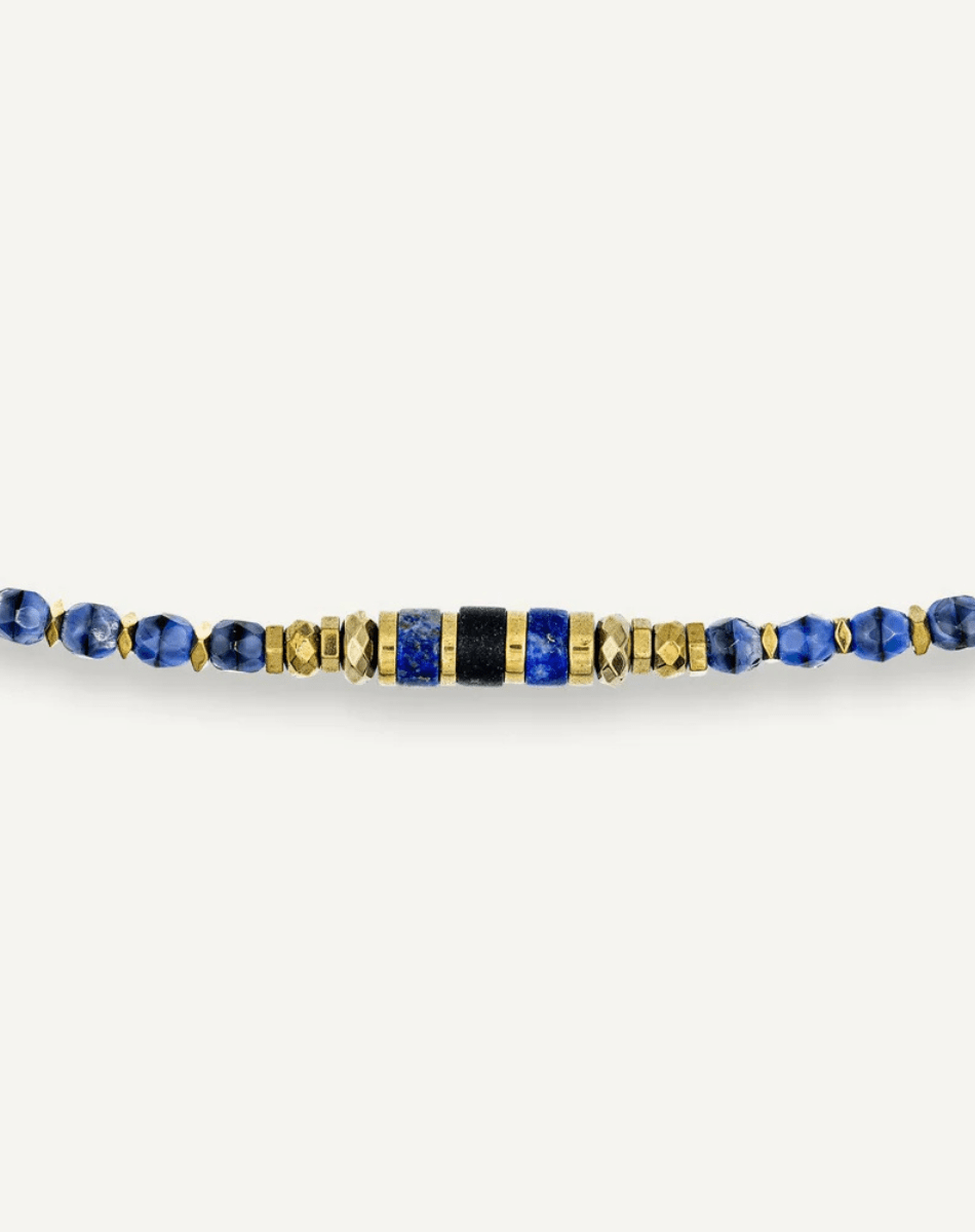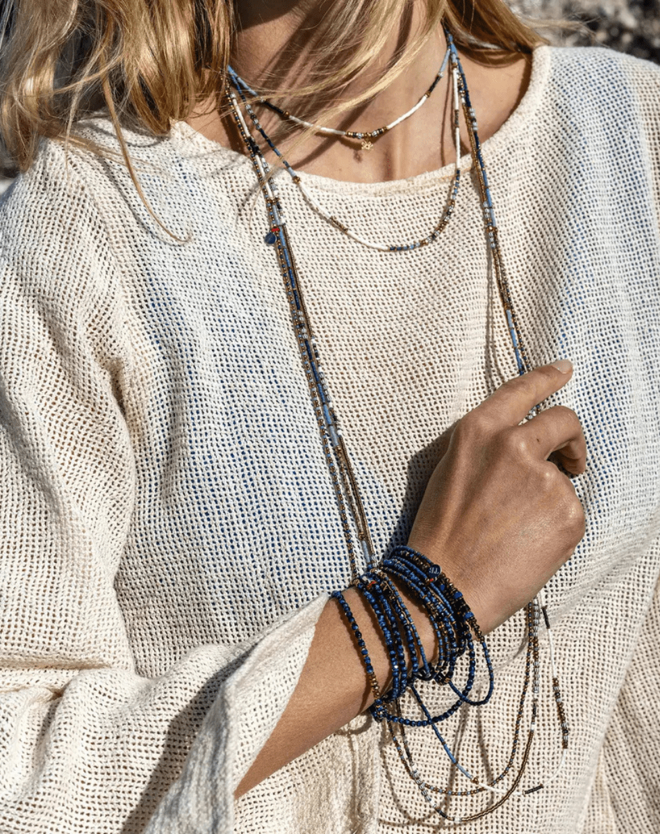 Le OCEAN 3 – Denim est un bijou féminin aux nuances profondes, composé de perles de Bohême facettées d’un bleu denim et d’Heishi en Lapis Lazuli.