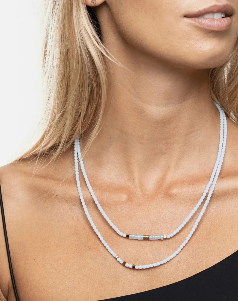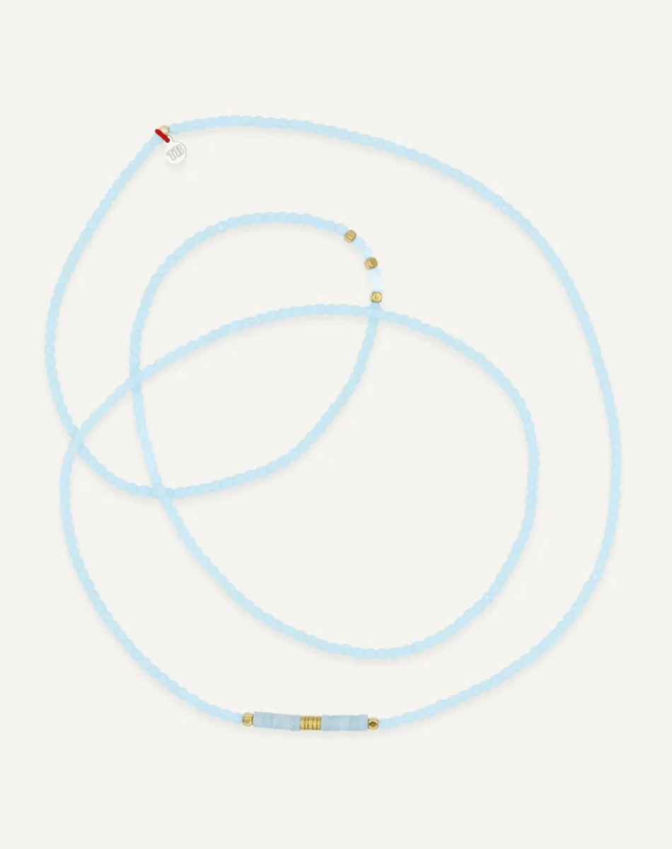 Le NADEGE Bleu Ciel est un bijou 2-en-1 au charme intemporel, qui se porte selon vos envies, en sautoir ou en bracelet six tours.