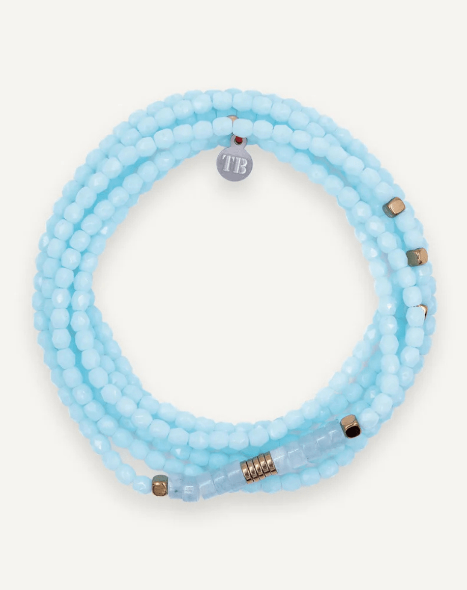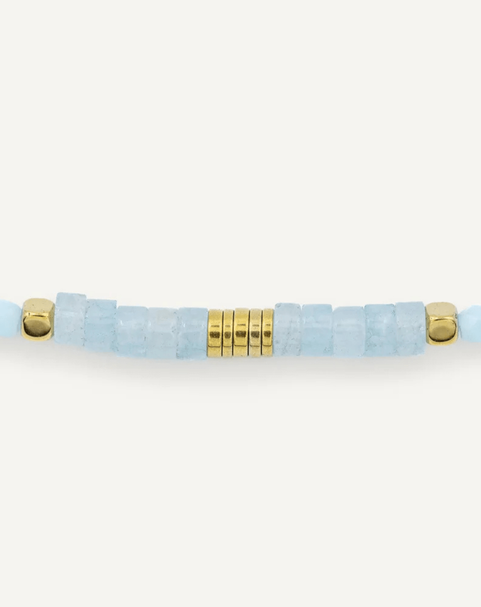Décliné dans une version douce et pastel, il se compose de perles facettées en cristal Bleu Ciel, subtilement rythmées par des incrustations cylindriques d’Aigue-Marine et d’Hématite, pour un éclat délicat et lumineux.
