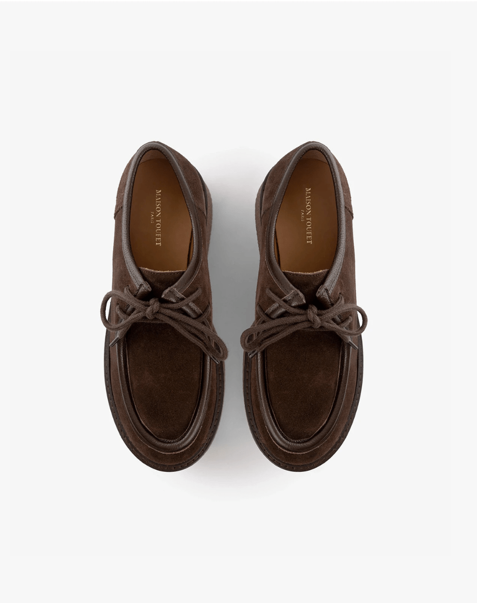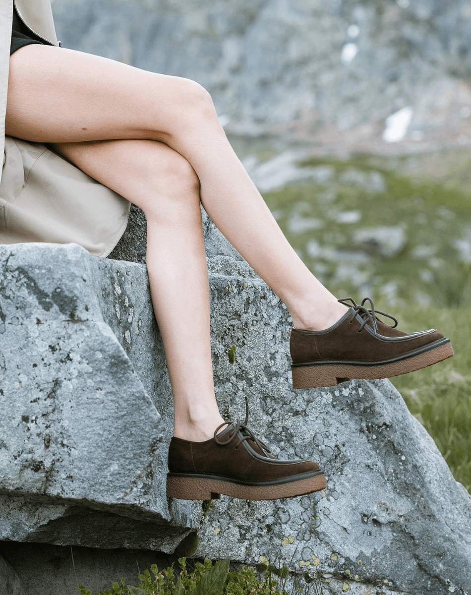 La derby Roberta séduit par son allure casual chic, alliant cuir suédé marron et semelle crêpe. À la fois confortable et singulière, elle combine avec élégance une note vintage et une touche contemporaine.