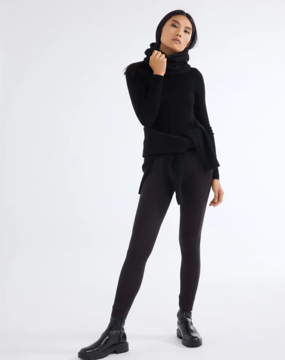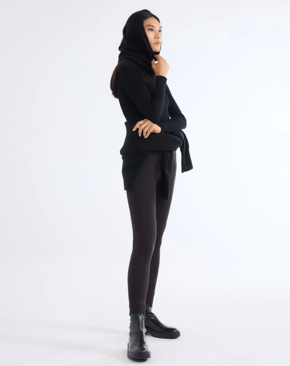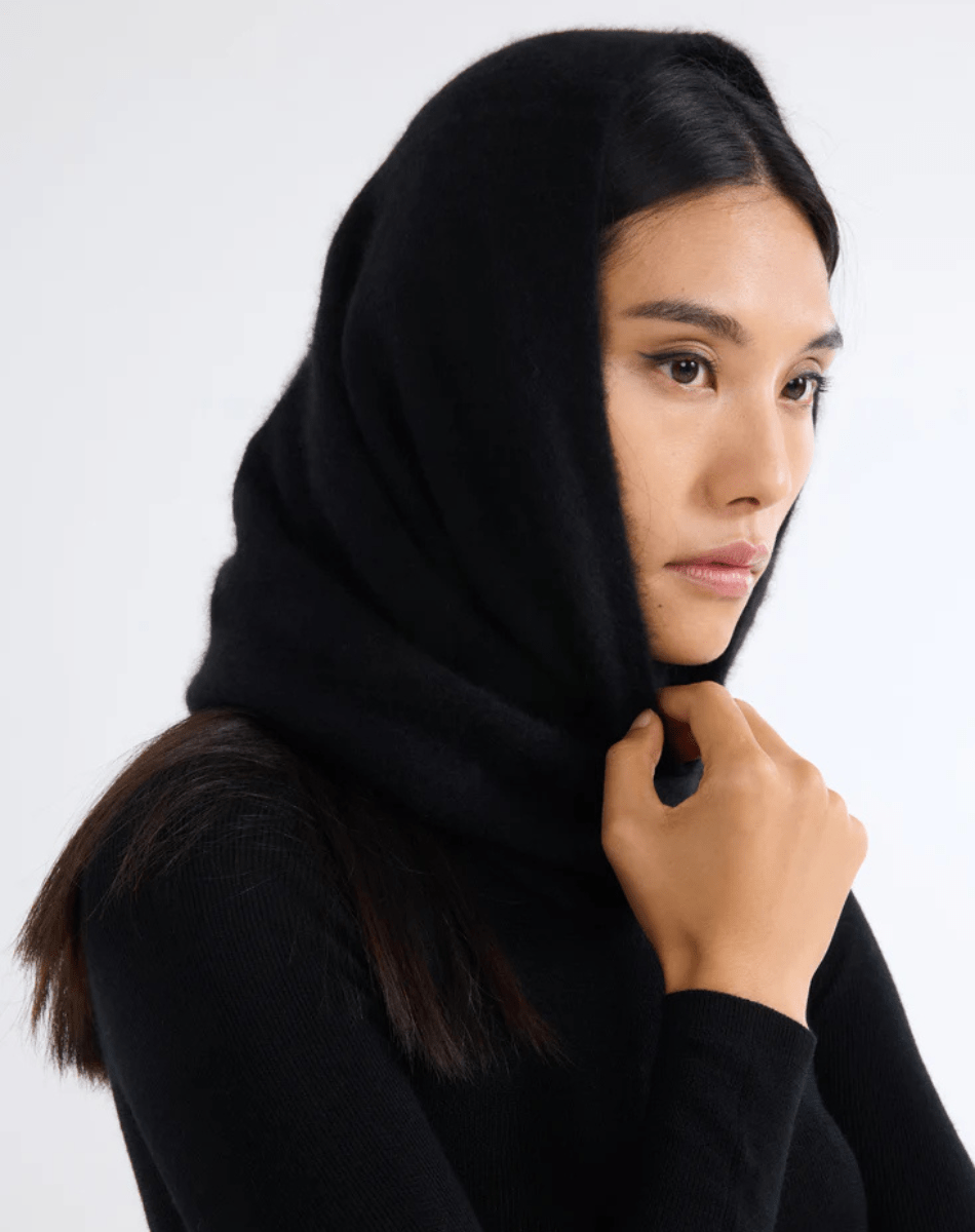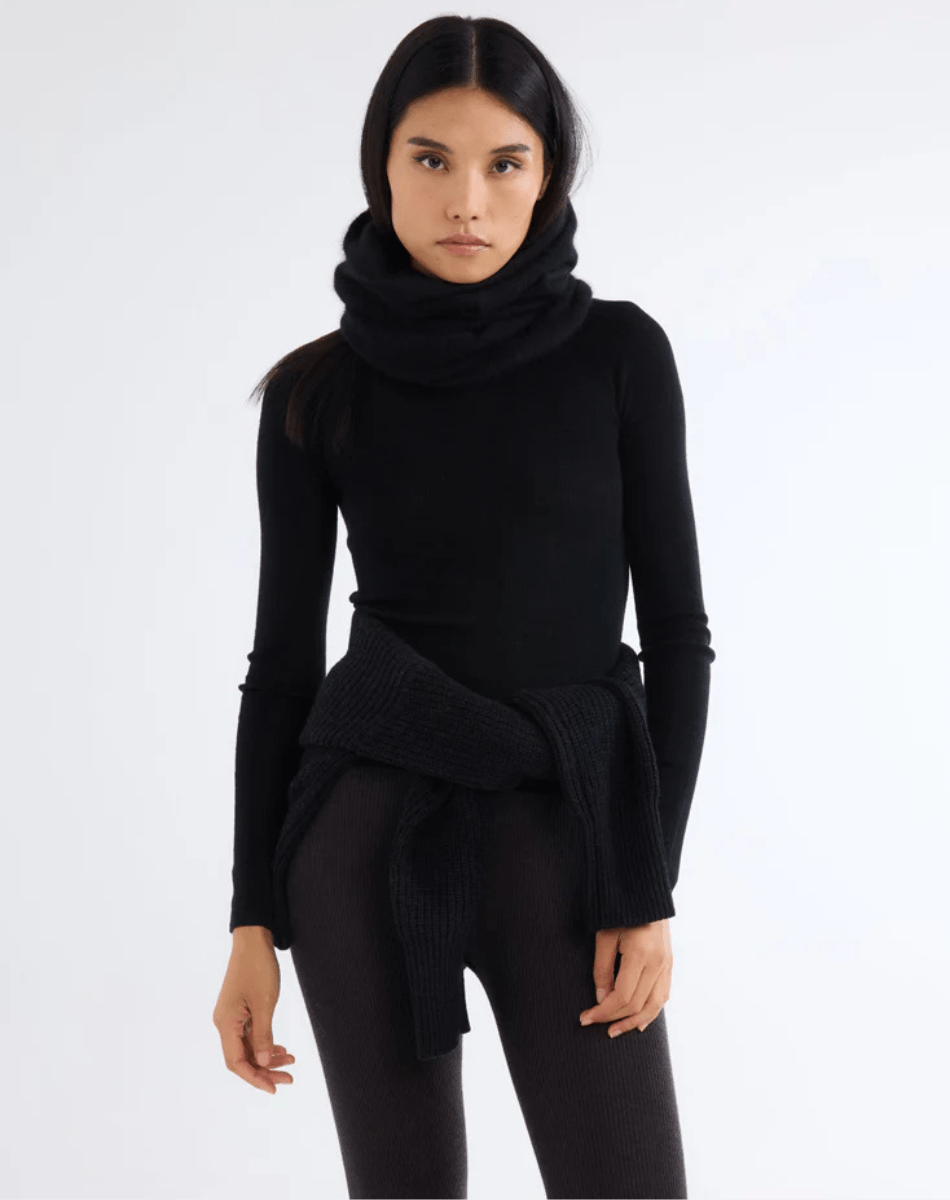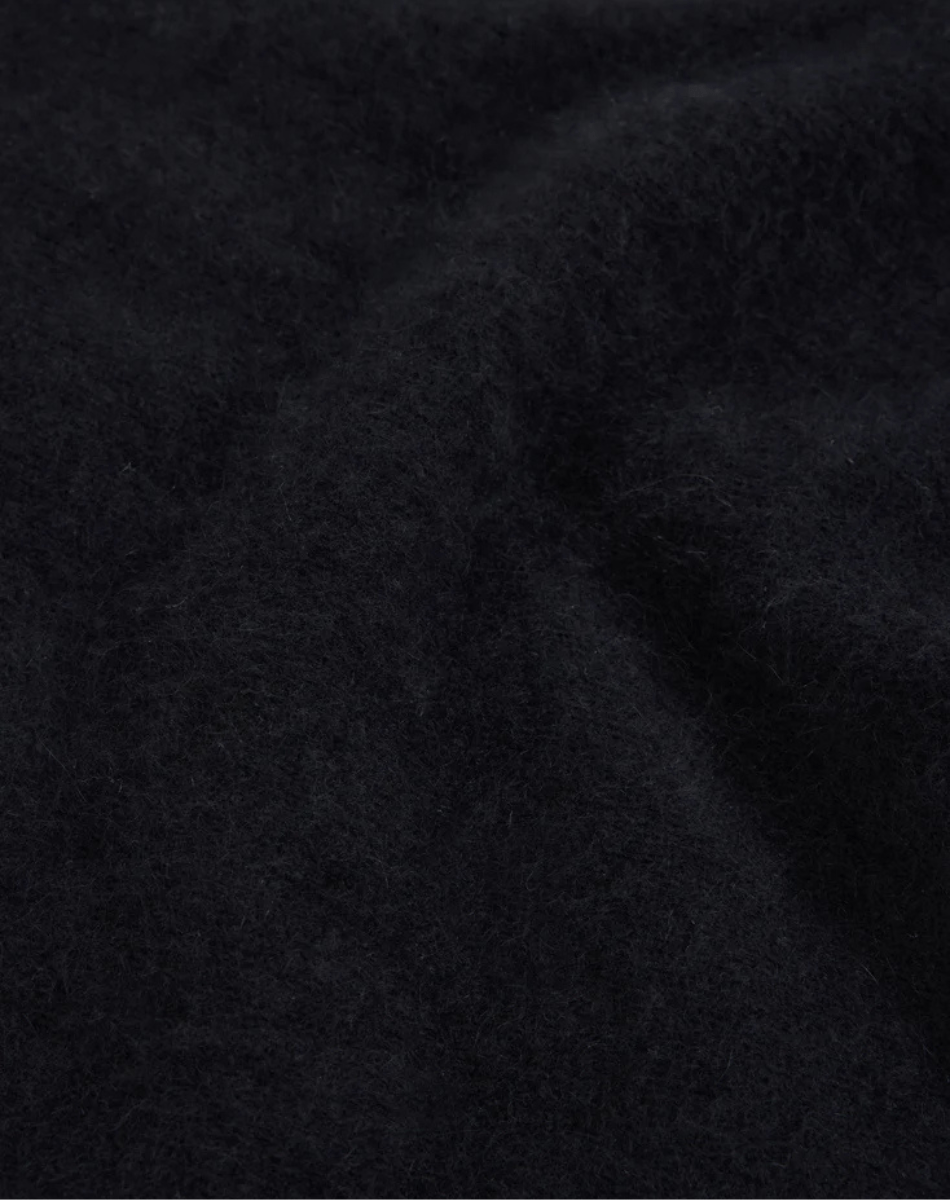 Écharpe noire en laine de raccon et polyamide, à la fois douce, légère et naturellement chaude. Elle apporte confort et élégance tout en protégeant du froid.