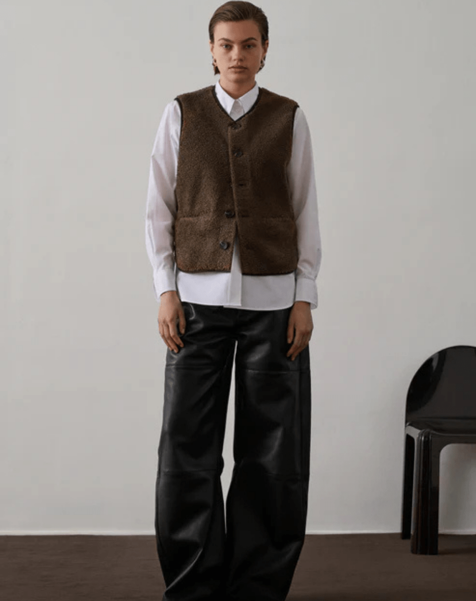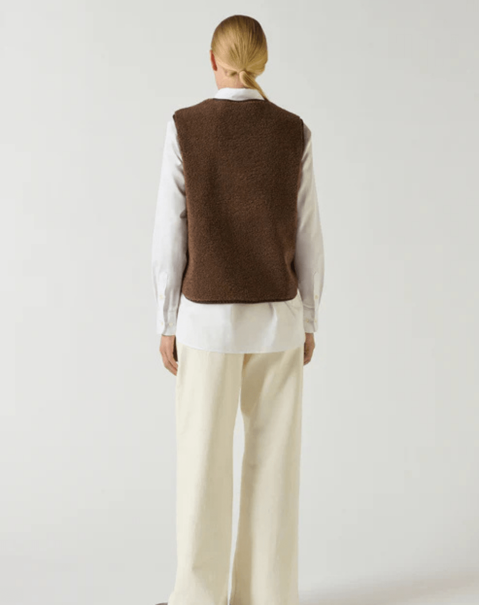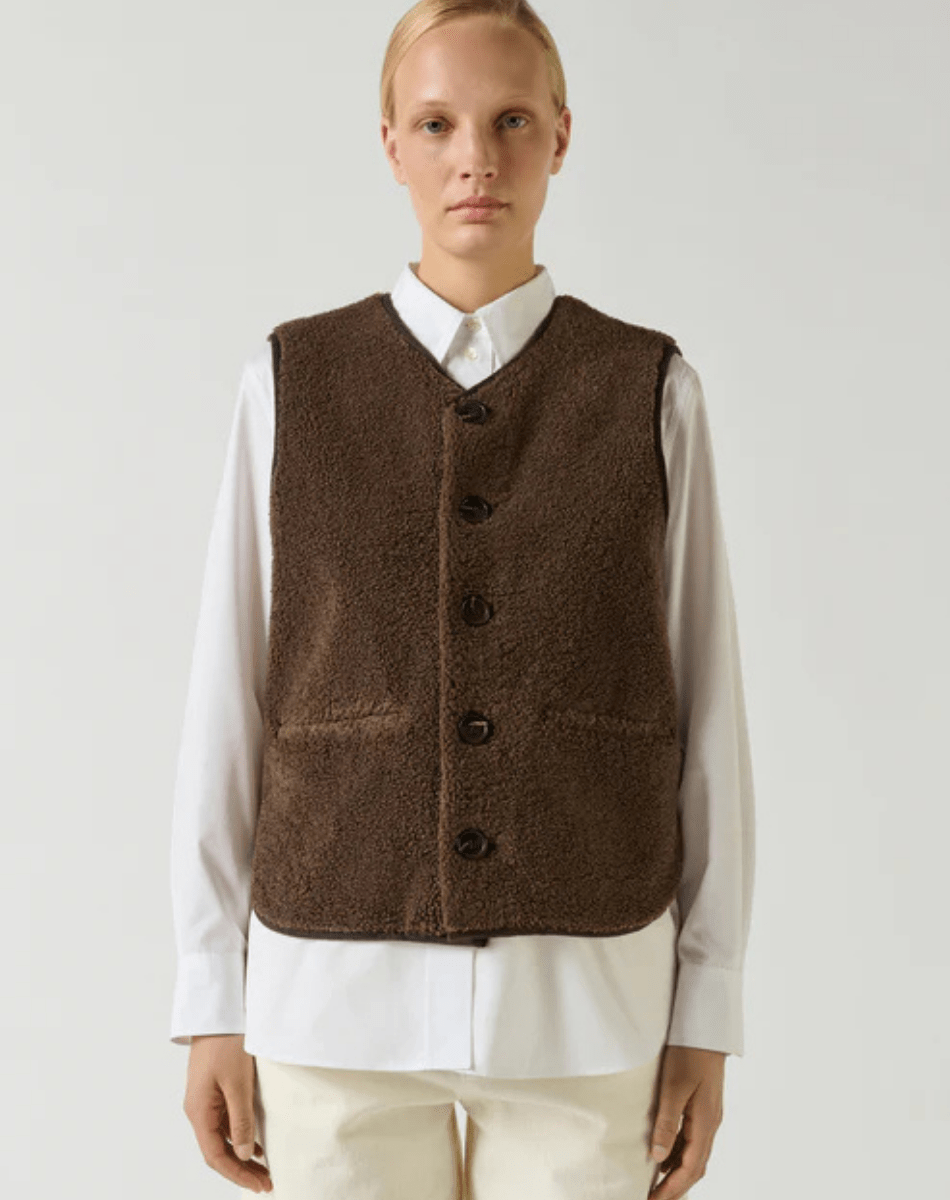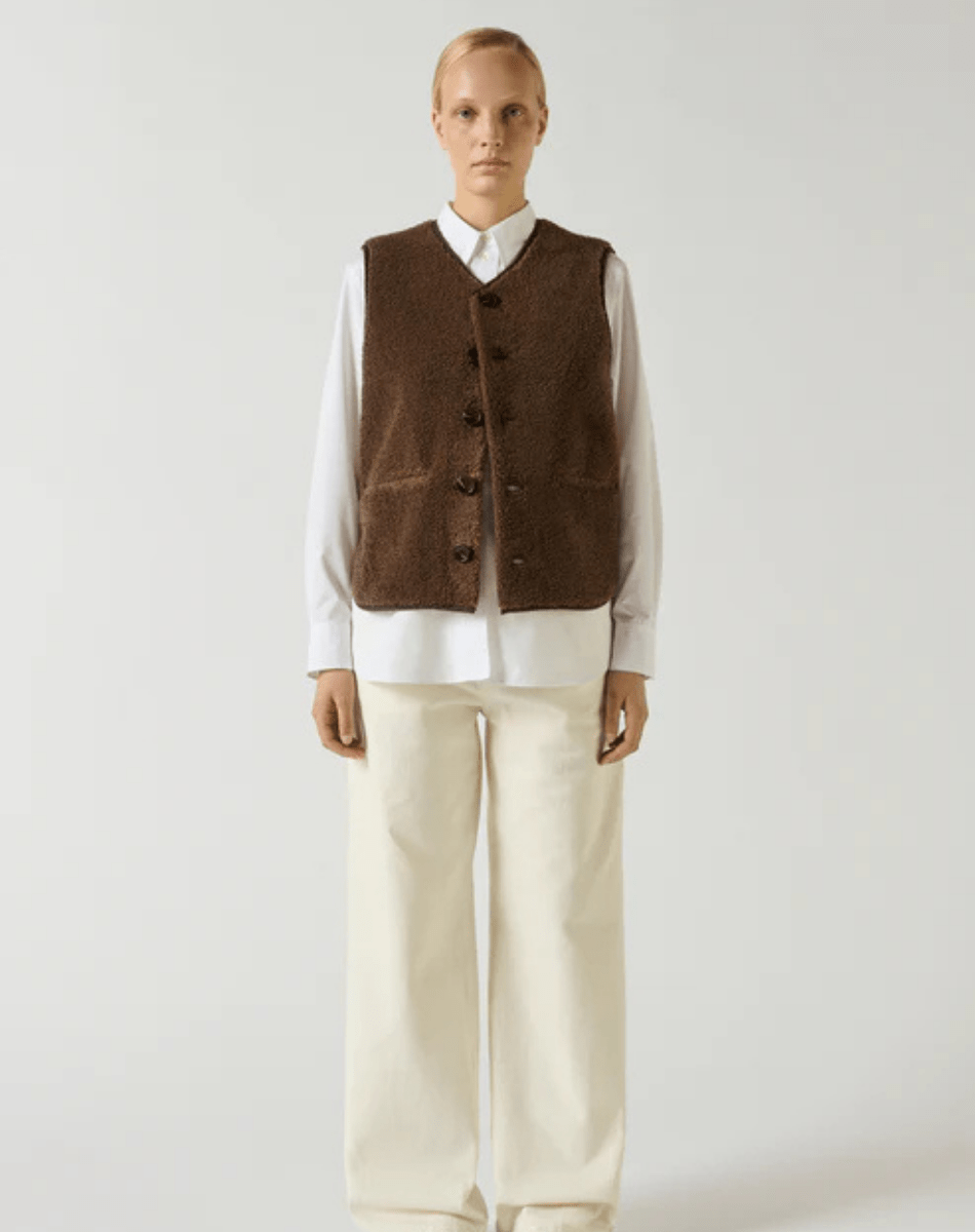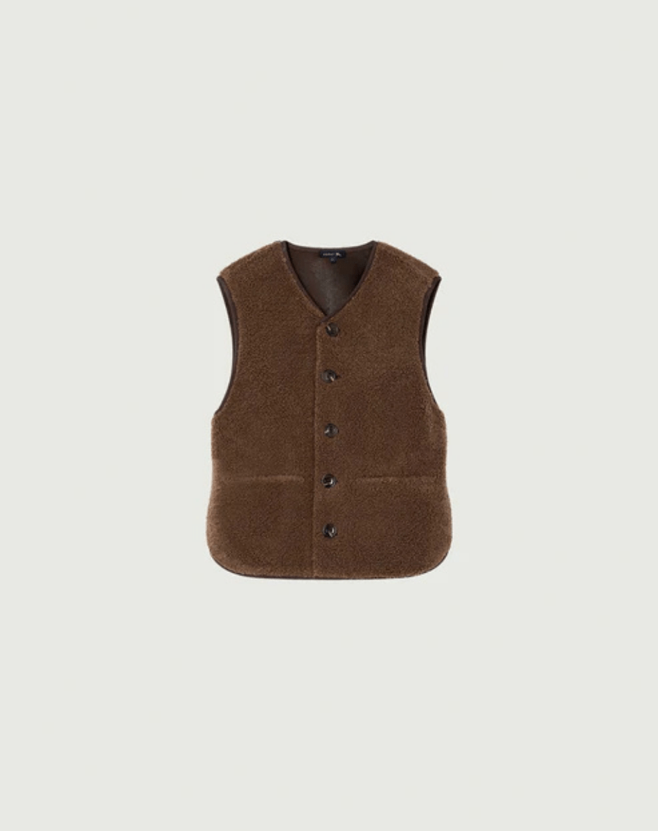 La veste Fusil est une pièce incontournable du vestiaire Soeur, conçue comme un gilet à styliser à l’infini. Elle présente une coupe droite, une encolure en V, une ouverture boutonnée devant, deux poches passepoilées et des finitions gansées. Elle peut se glisser sous un manteau ou se superposer à un simple t-shirt.