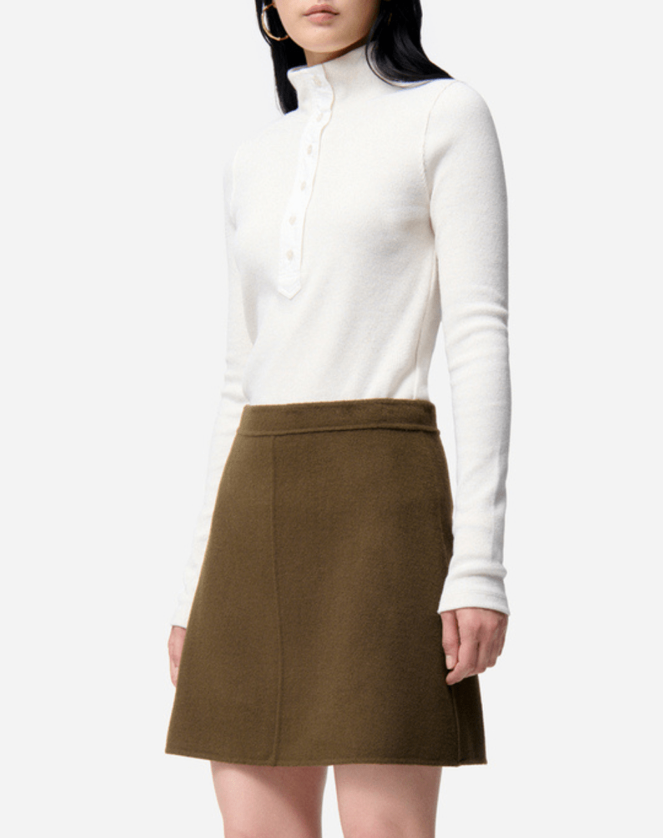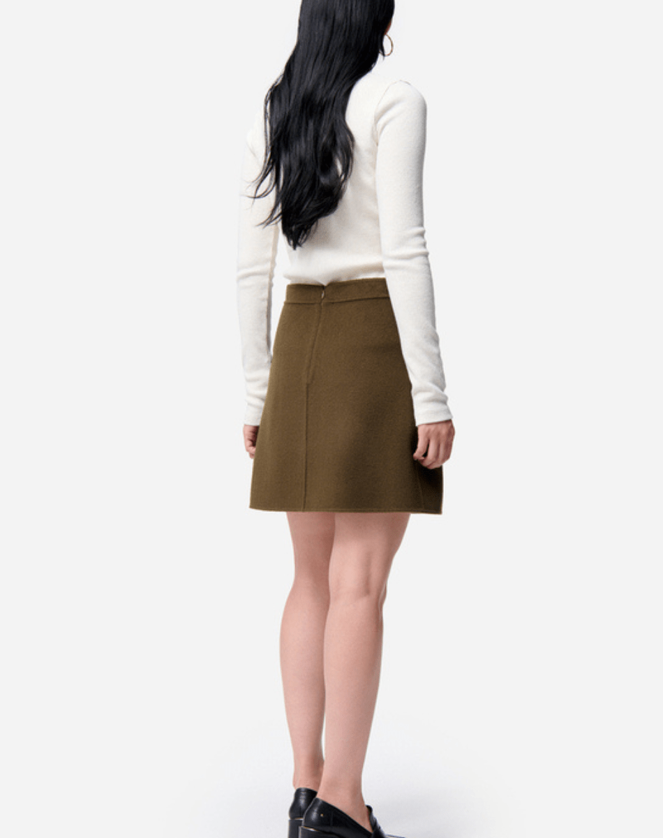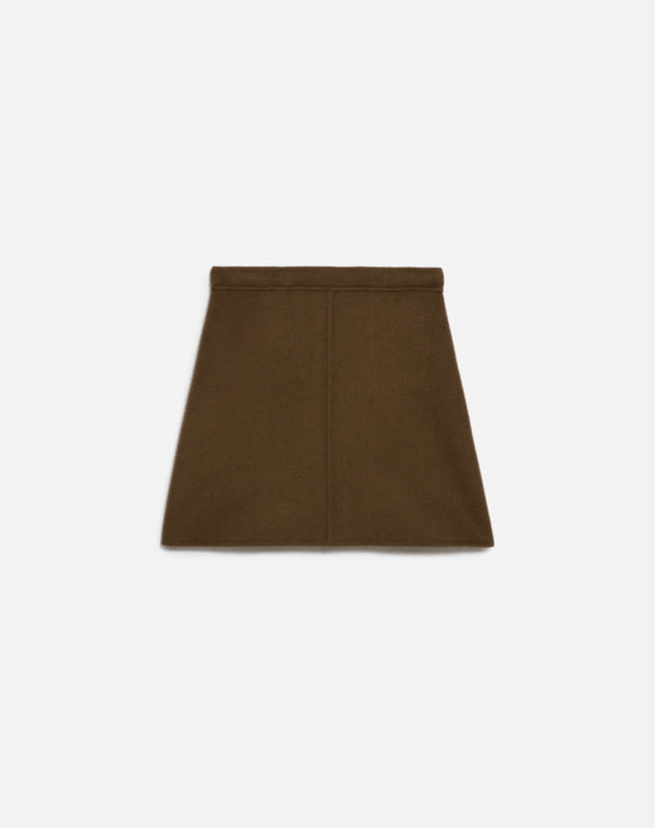 Mini-jupe en laine double face, à la coupe structurée. Elle incarne une allure contemporaine et fonctionnelle, sublimée par une élégance minimaliste.