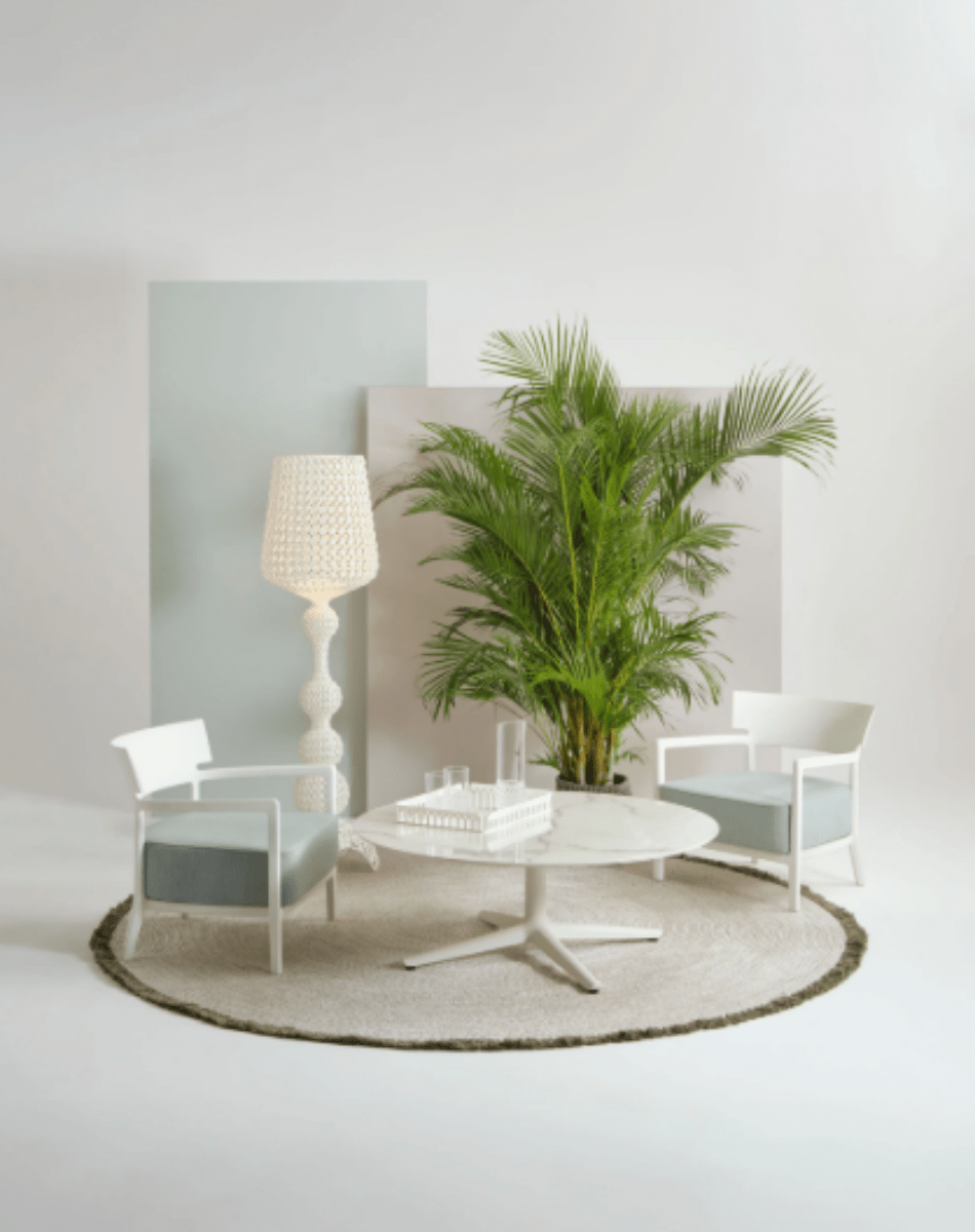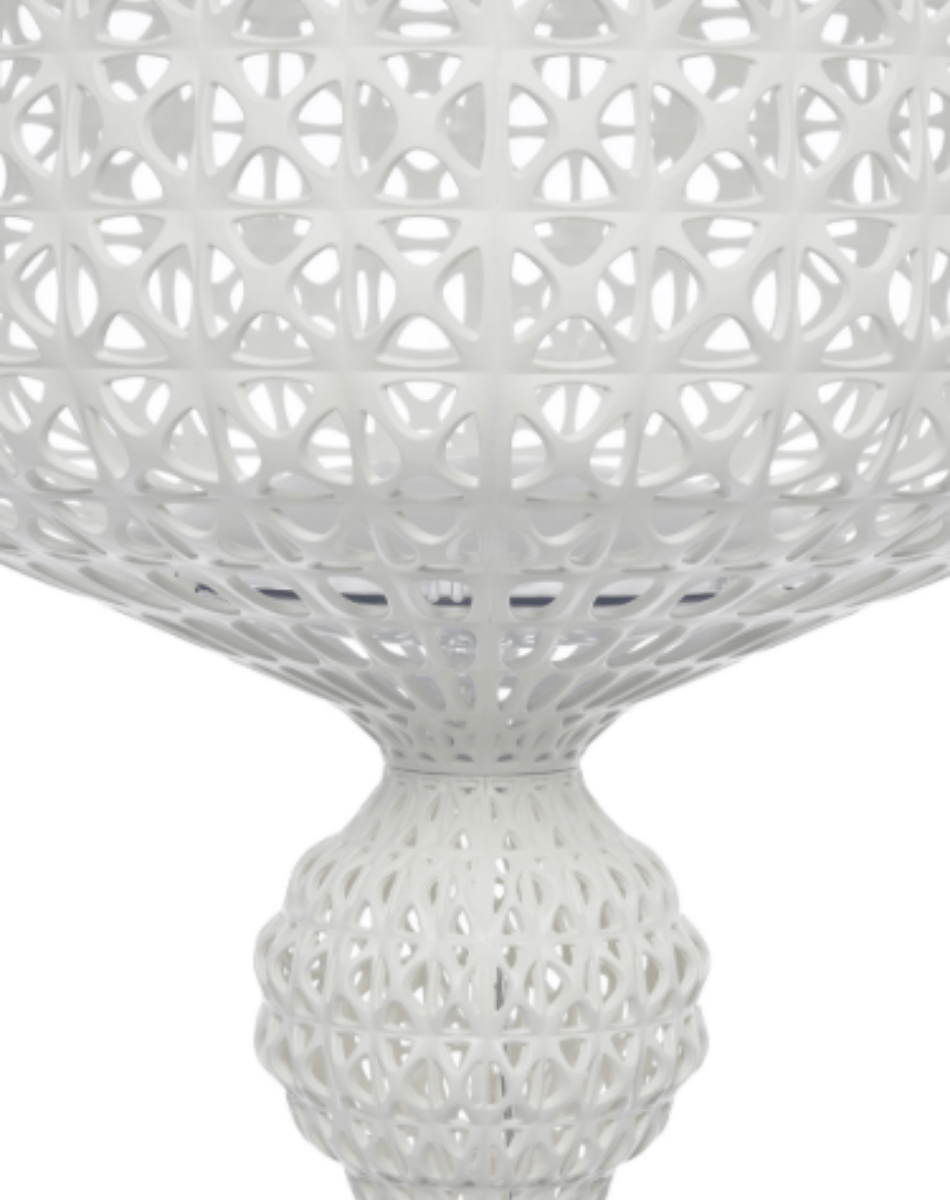 Le lampadaire Kabuki est une pièce forte au croisement du baroque et du contemporain : un abat-jour façonné selon une structure ajourée rappelant une dentelle, créée grâce à une technologie d’injection de technopolymère, qui diffuse une lumière douce et poétique.