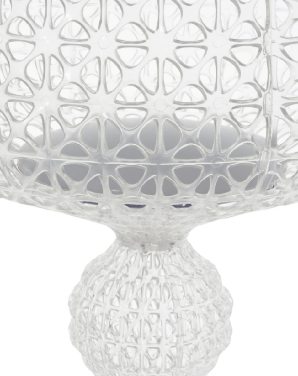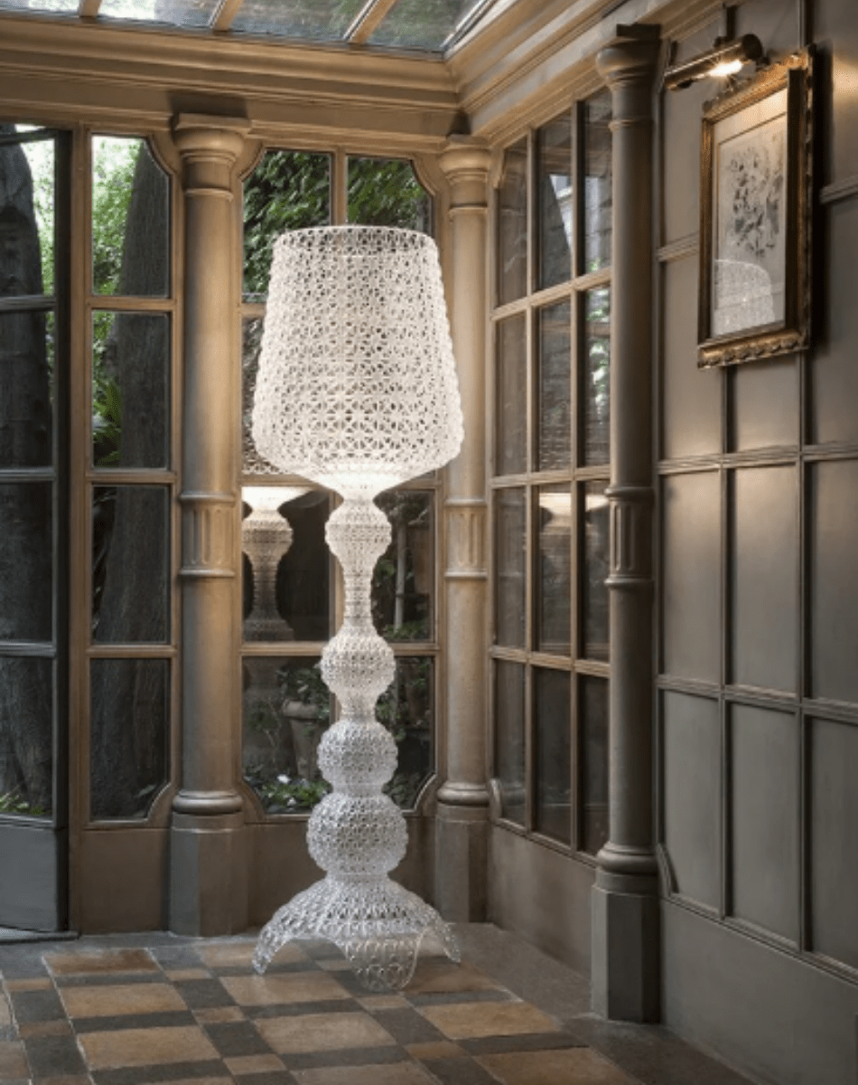 Le lampadaire Kabuki est une pièce forte au croisement du baroque et du contemporain : un abat-jour façonné selon une structure ajourée rappelant une dentelle, créée grâce à une technologie d’injection de technopolymère, qui diffuse une lumière douce et poétique.