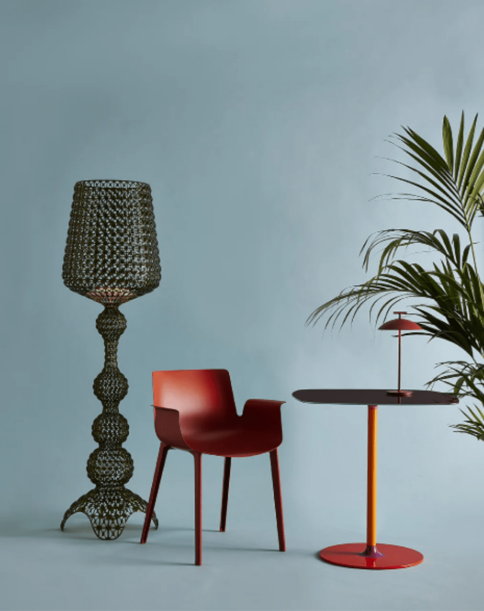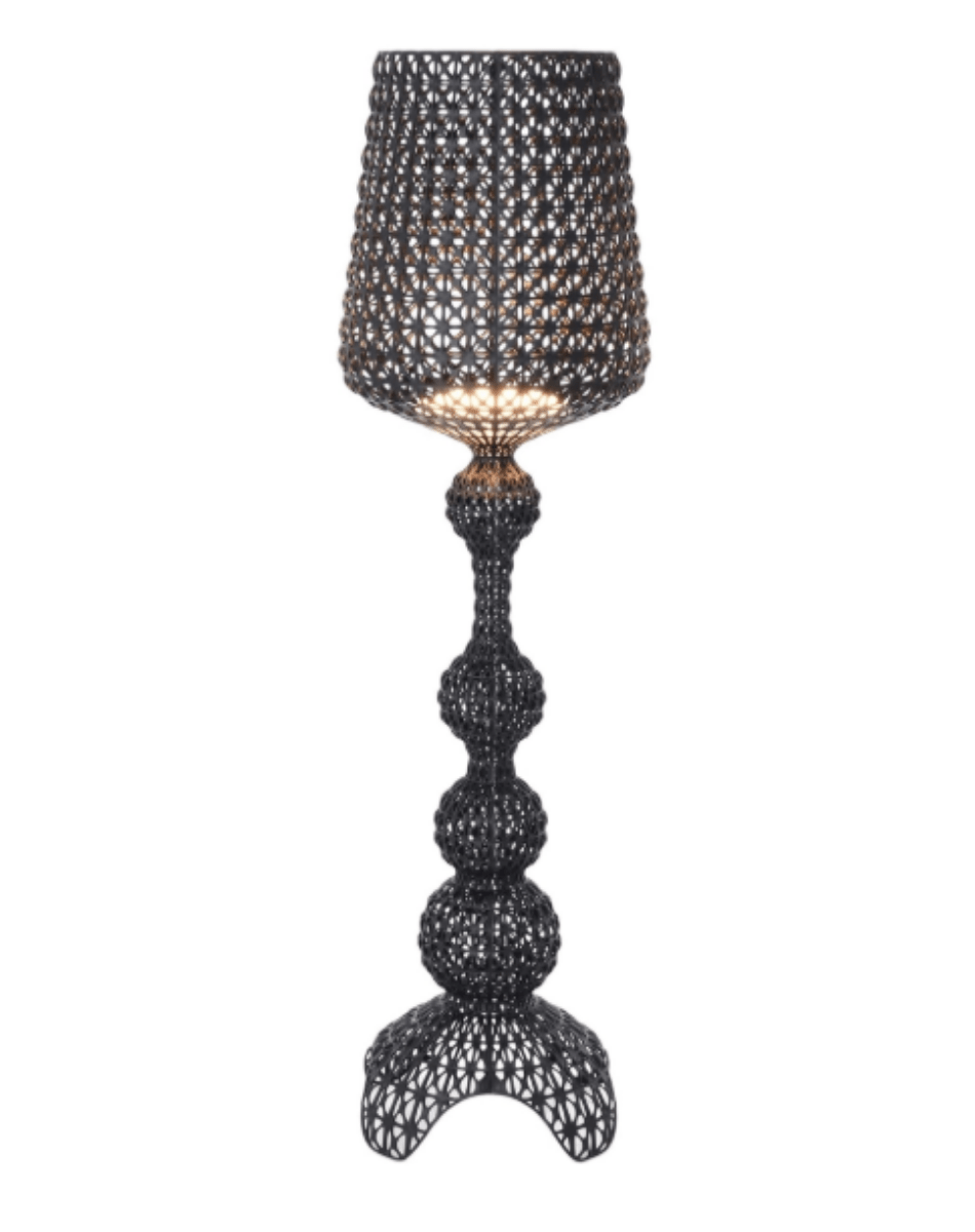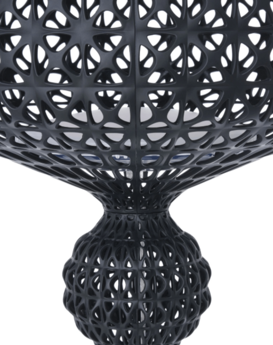Le lampadaire Kabuki est une pièce forte au croisement du baroque et du contemporain : un abat-jour façonné selon une structure ajourée rappelant une dentelle, créée grâce à une technologie d’injection de technopolymère, qui diffuse une lumière douce et poétique.