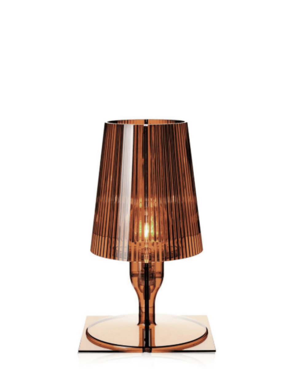 Take, conçue par Ferruccio Laviani, est une lampe de table qui revisite le classique abat-jour de chevet avec audace. Elle se caractérise par deux plaques symétriques qui se rejoignent pour former un volume semi-lamp shade, et un diffuseur intérieur plissé créant des reflets lumineux délicats. Compacte, elle s’intègre aussi bien sur une table de chevet que dans un salon contemporain.