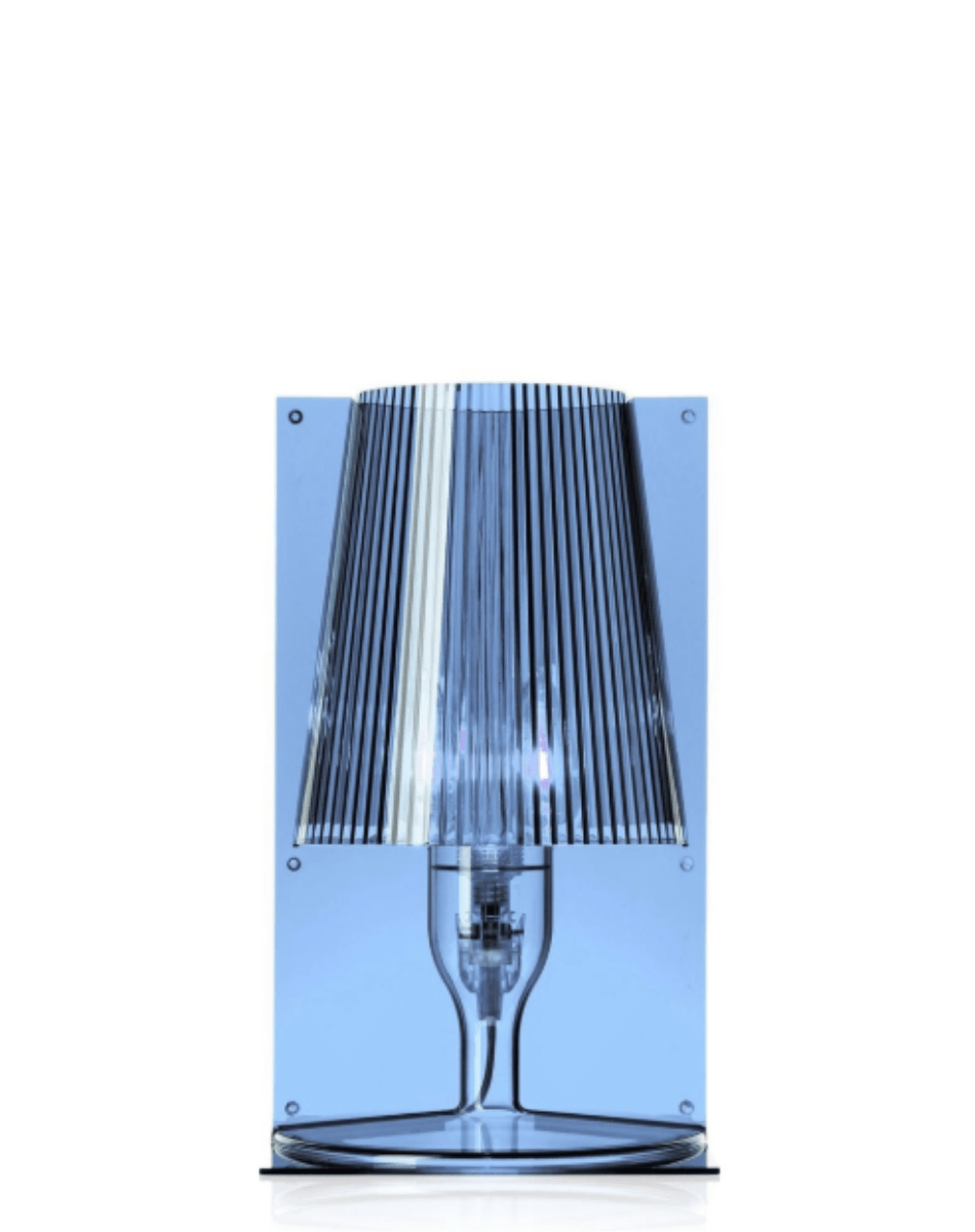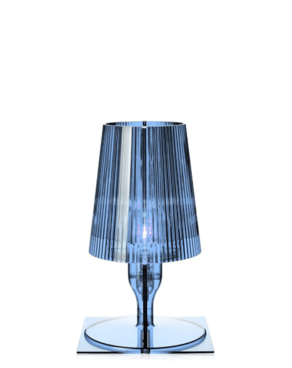 Take, conçue par Ferruccio Laviani, est une lampe de table qui revisite le classique abat-jour de chevet avec audace. Elle se caractérise par deux plaques symétriques qui se rejoignent pour former un volume semi-lamp shade, et un diffuseur intérieur plissé créant des reflets lumineux délicats. Compacte, elle s’intègre aussi bien sur une table de chevet que dans un salon contemporain.