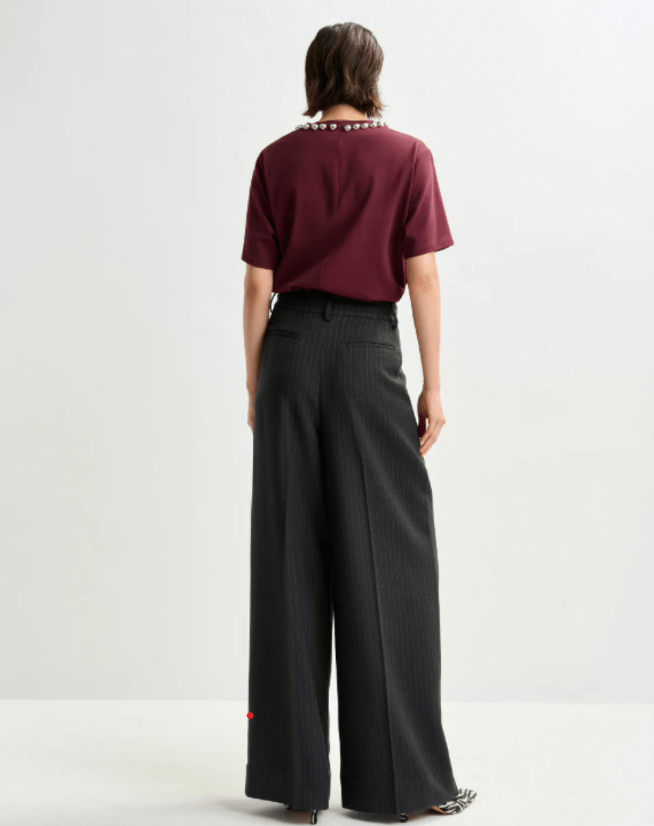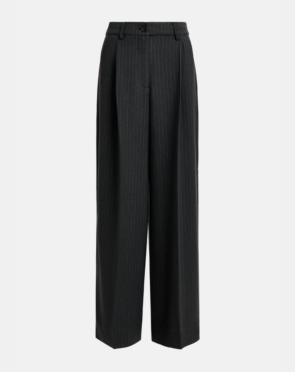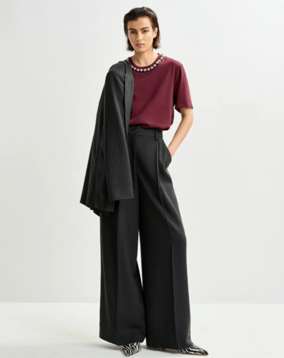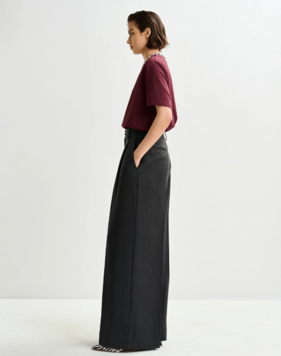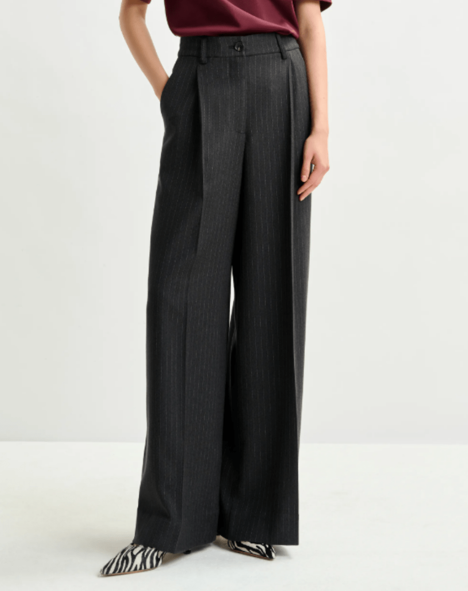 Pantalon raffiné doté de plis à la taille, qui s’évasent en une silhouette à larges jambes fluides. Il se complète de poches italiennes à l’avant, de deux poches passepoilées à l’arrière, d’une fermeture zippée avec bouton et de plis repassés à l’avant et à l’arrière, pour une finition soignée. À associer à un chemisier rentré et des bottes à talon pour mettre en valeur la taille haute, ou accessoirisé d’une ceinture pour un look plus structuré et ajusté.