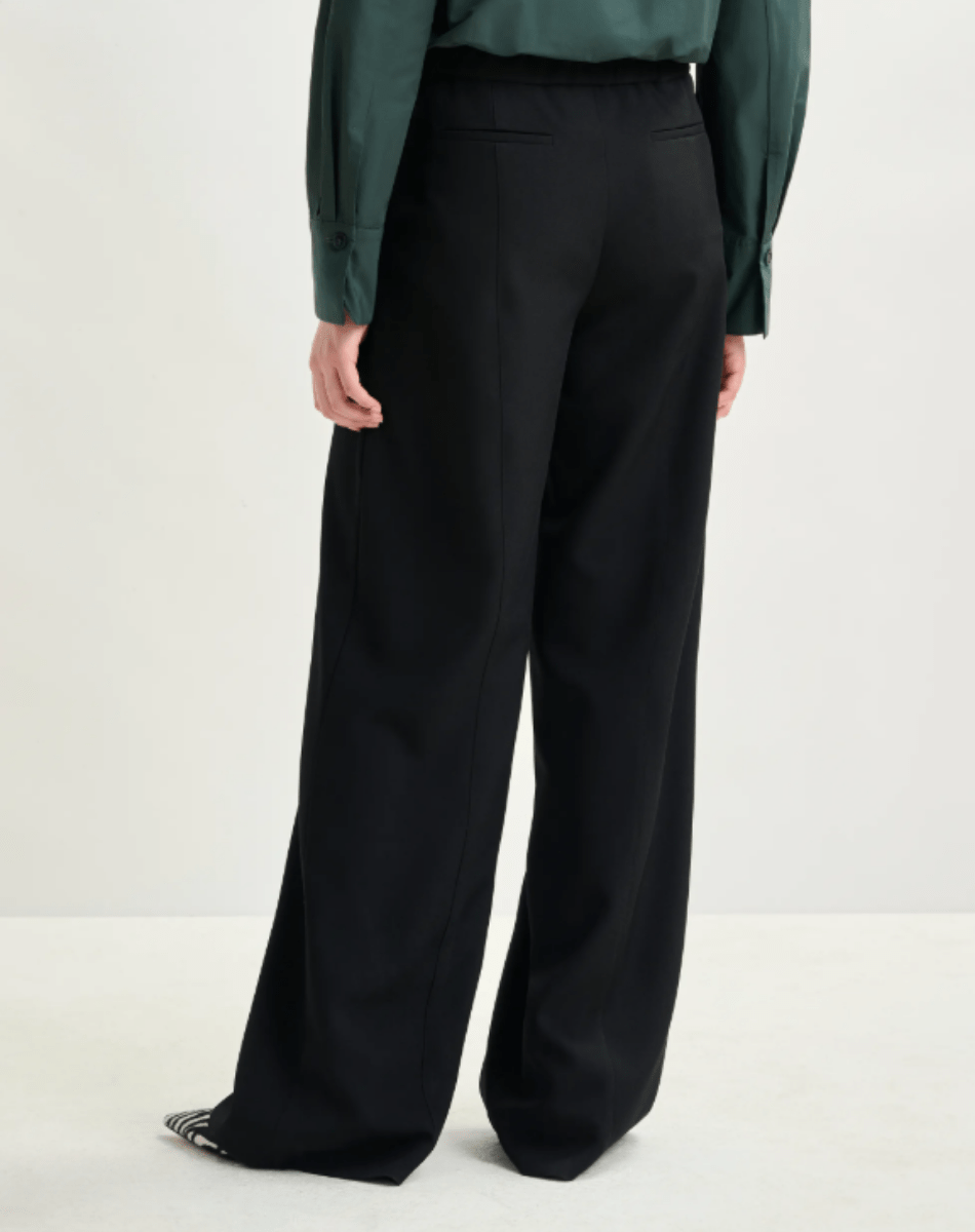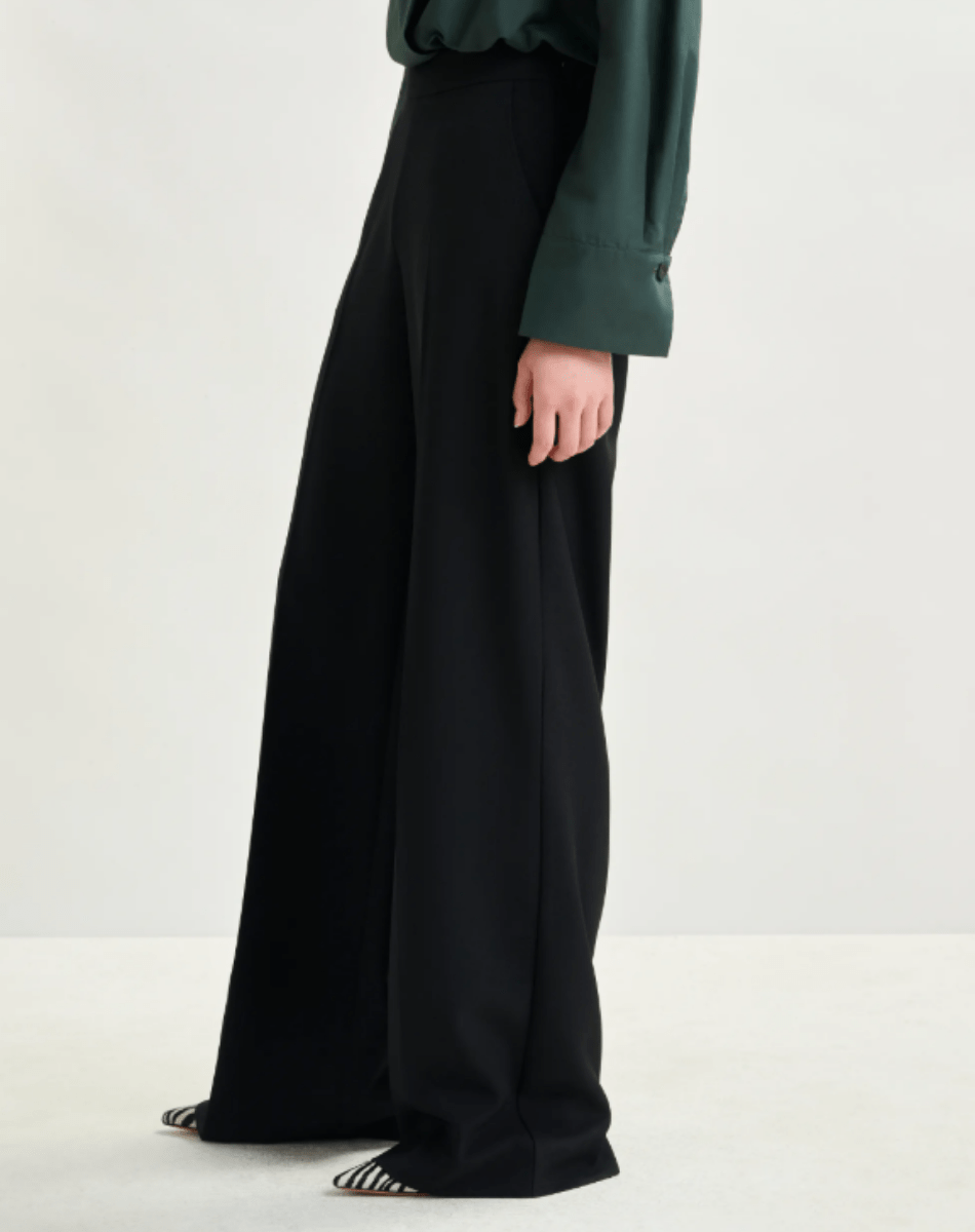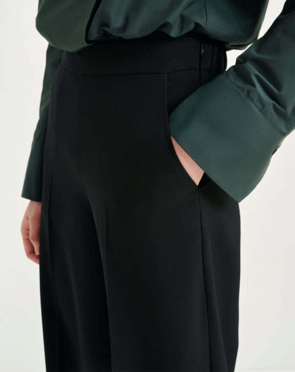 Pantalon taille haute à la coupe large, pensé pour allier confort et raffinement. Sa taille élastiquée assure aisance et flexibilité, tandis que la fermeture zippée dissimulée apporte une finition soignée. Il est équipé de poches italiennes pratiques à l’avant et de poches passepoilées au dos pour une allure structurée. Des plis marqués à l’avant et à l’arrière soulignent la silhouette et confèrent au modèle une élégance distinguée.
