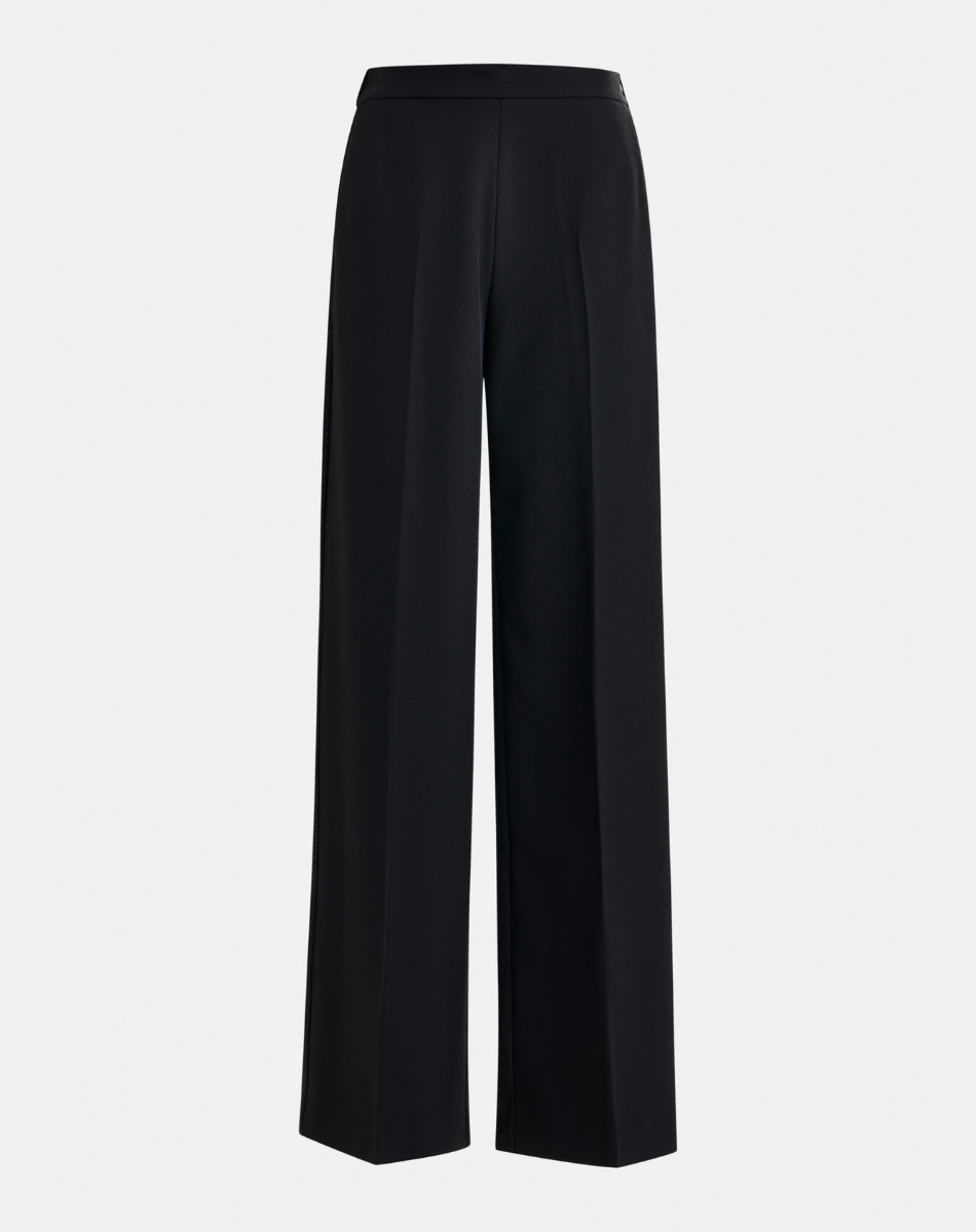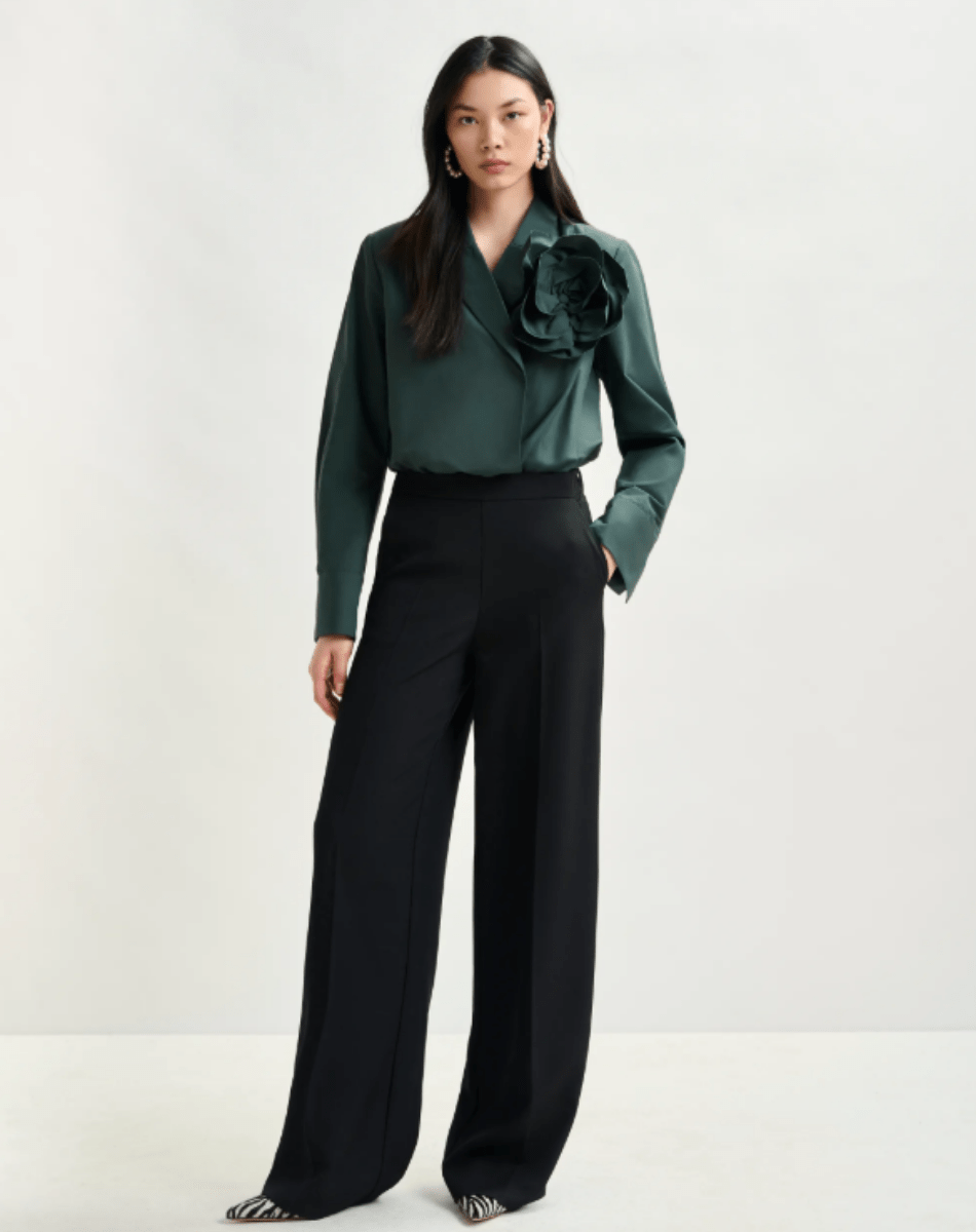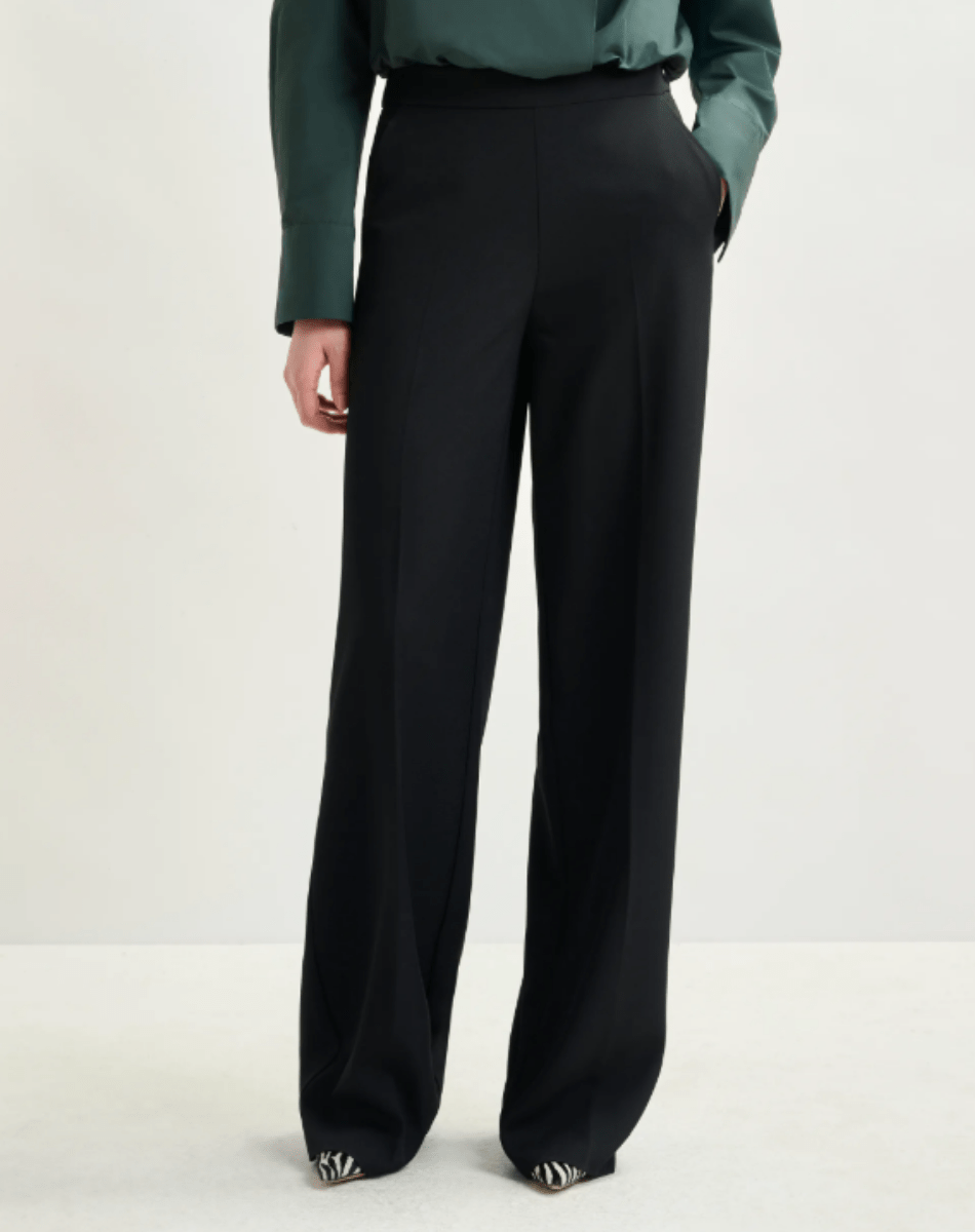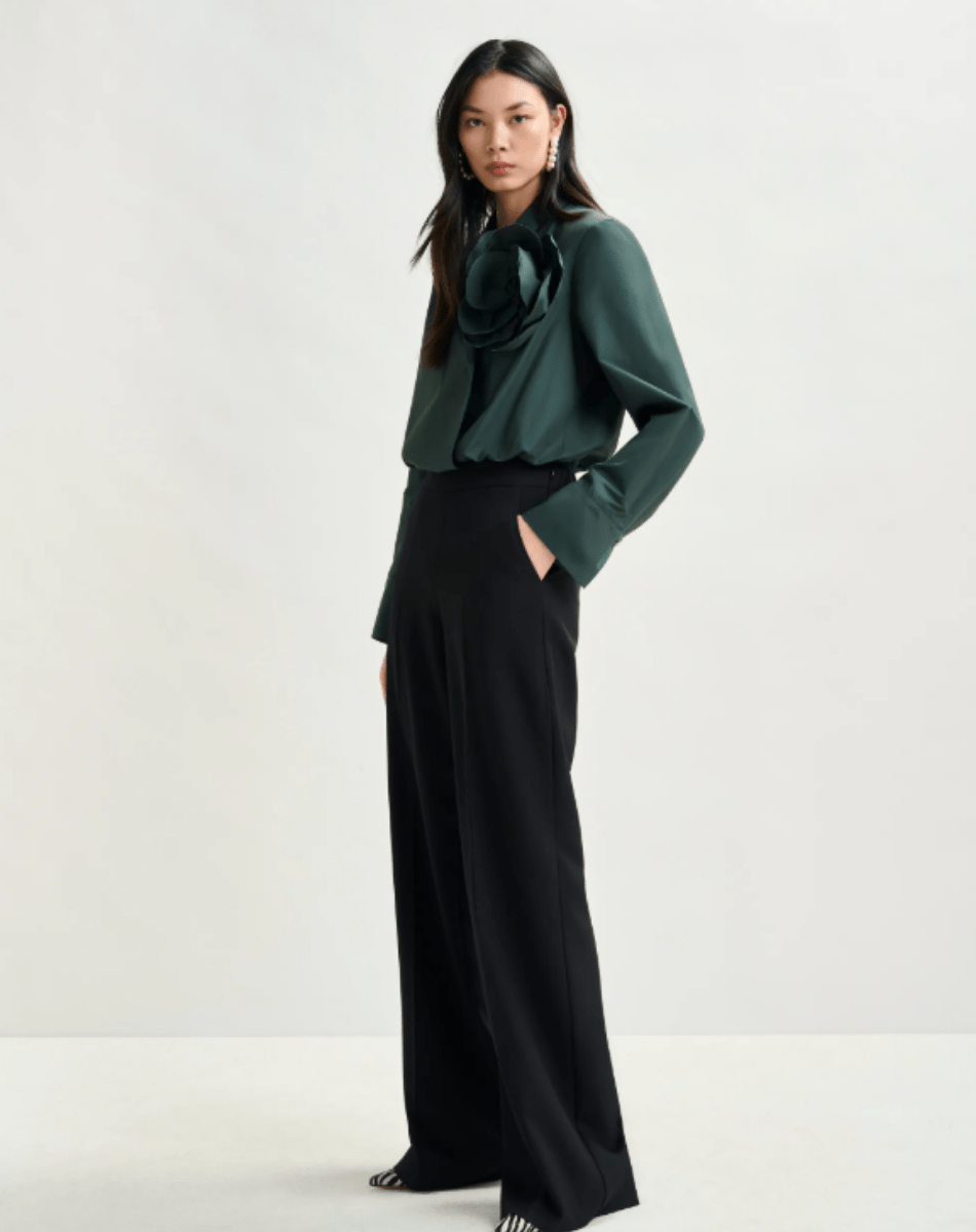 Pantalon taille haute à la coupe large, pensé pour allier confort et raffinement. Sa taille élastiquée assure aisance et flexibilité, tandis que la fermeture zippée dissimulée apporte une finition soignée. Il est équipé de poches italiennes pratiques à l’avant et de poches passepoilées au dos pour une allure structurée. Des plis marqués à l’avant et à l’arrière soulignent la silhouette et confèrent au modèle une élégance distinguée.