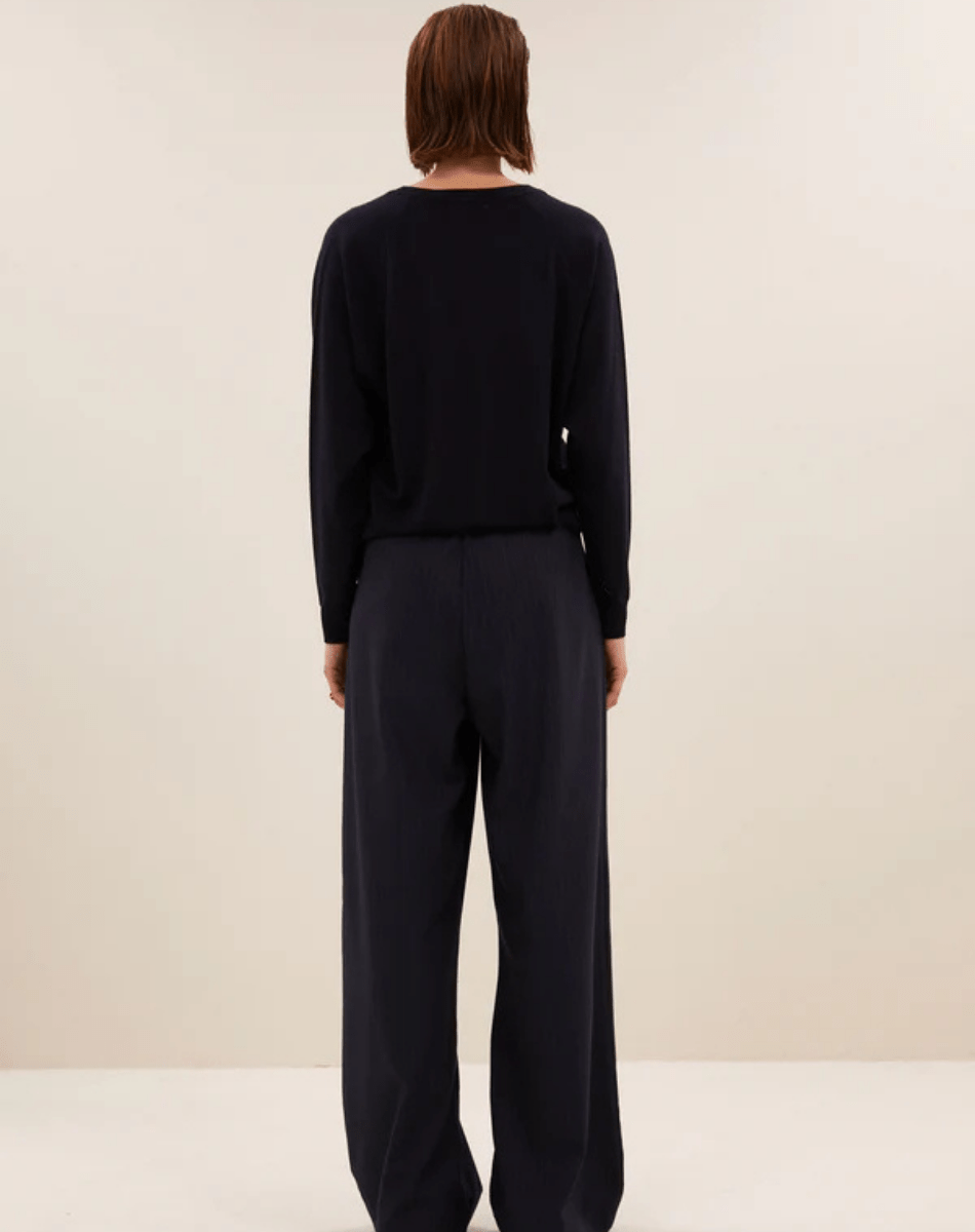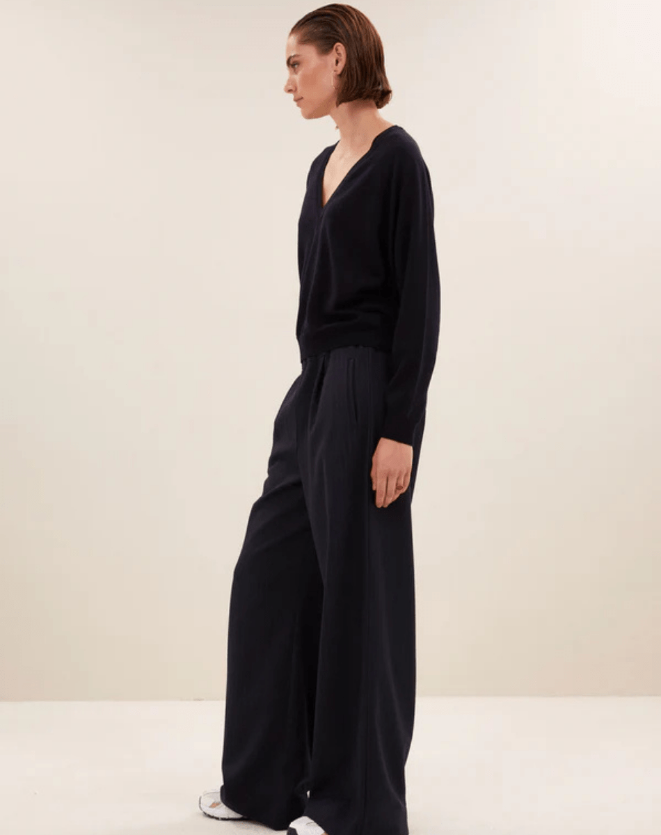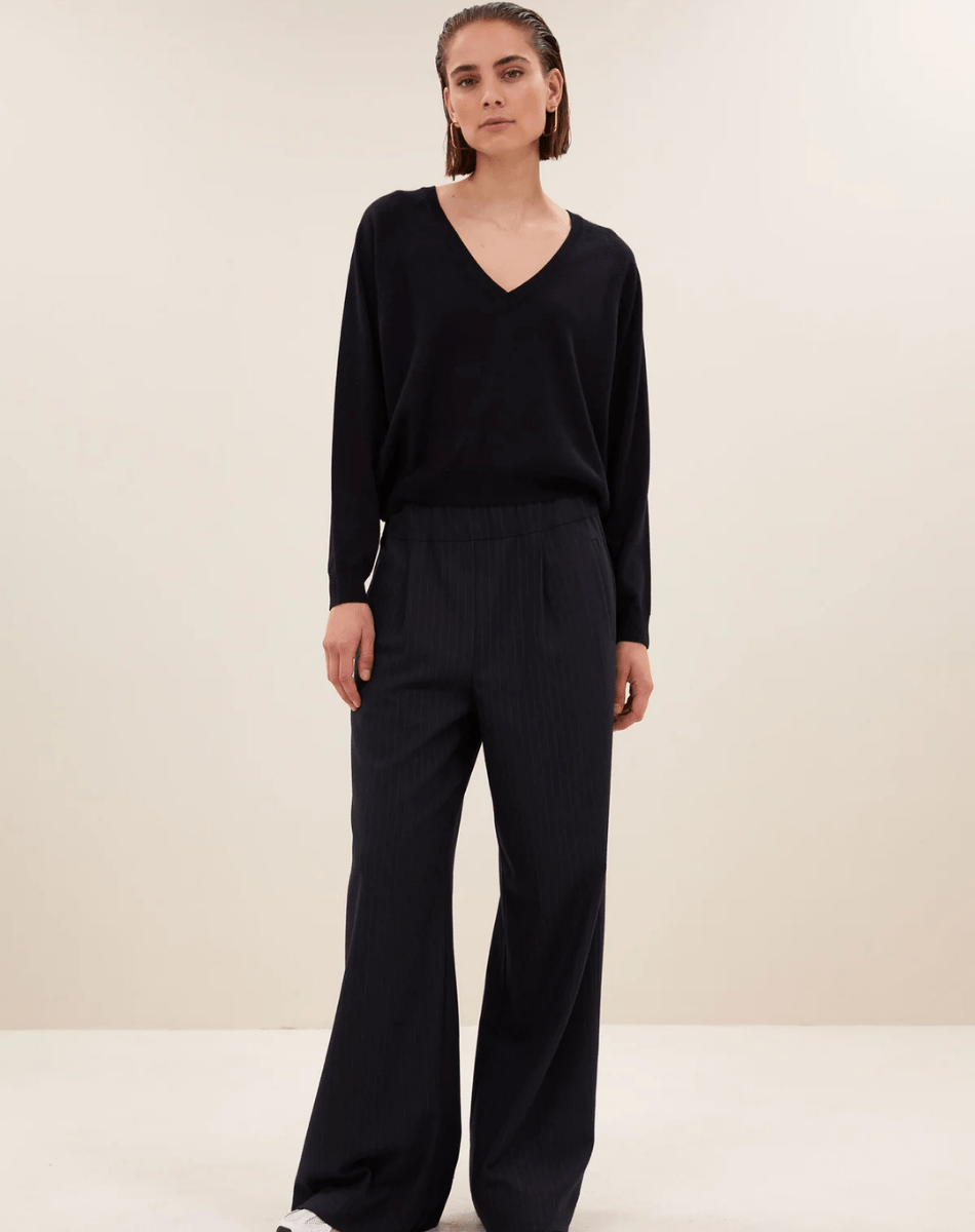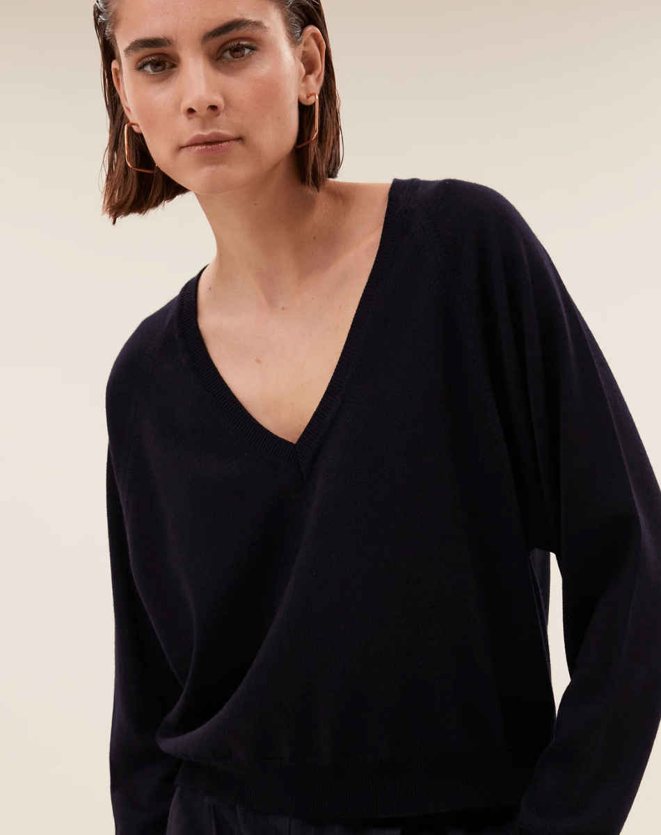 Pull col V en laine mérinos douce, rehaussé de bords côtelés. Sa coupe soignée et son confort en font une pièce intemporelle, parfaite pour un usage quotidien.