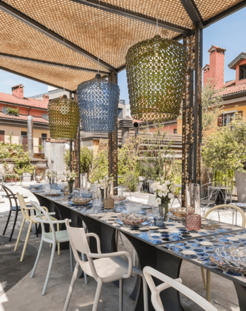 La suspension Kabuki est une pièce forte au croisement du baroque et du contemporain : un abat-jour façonné selon une structure ajourée rappelant une dentelle, créée grâce à une technologie d’injection de technopolymère, qui diffuse une lumière douce et poétique.