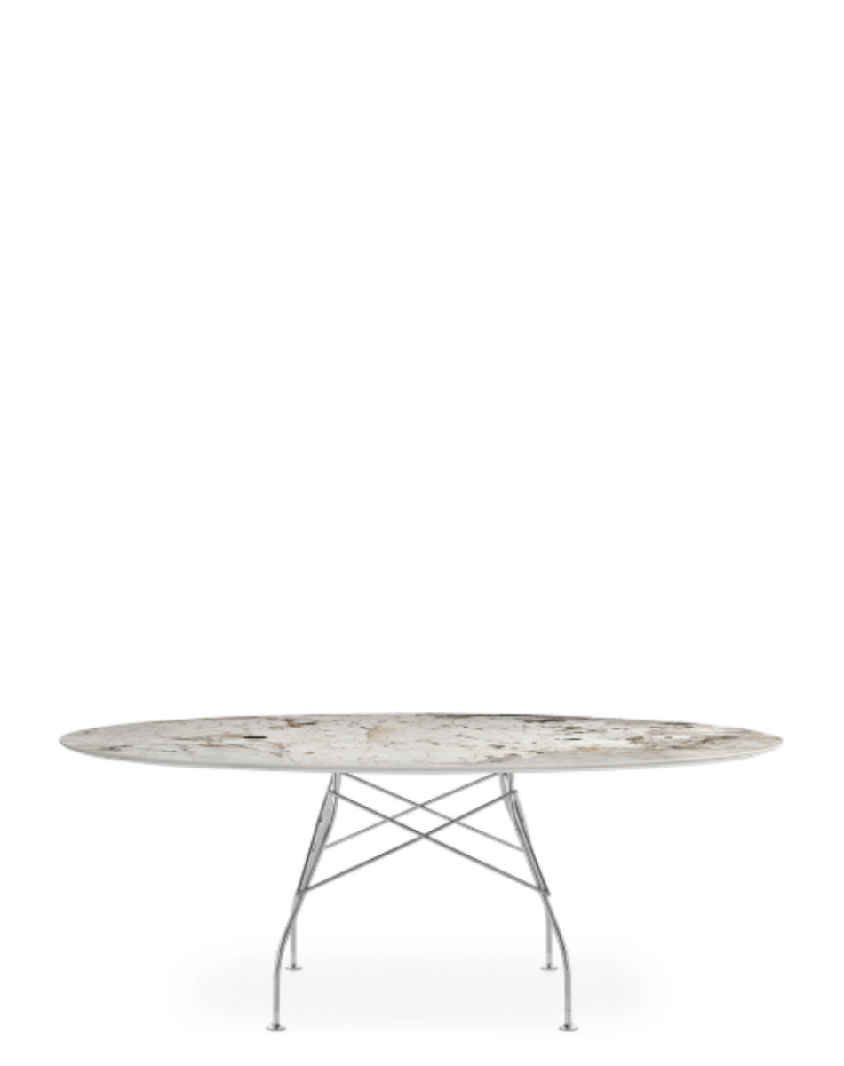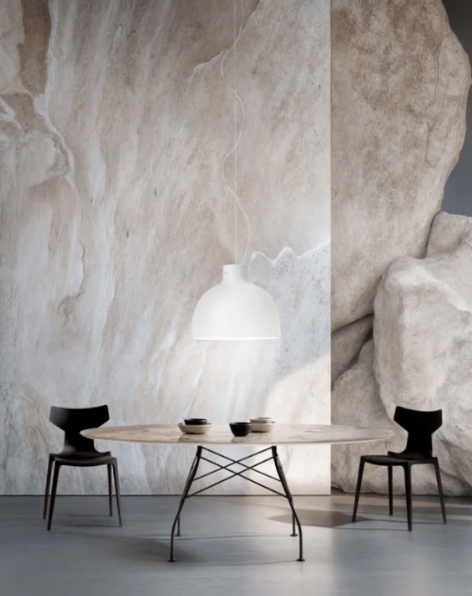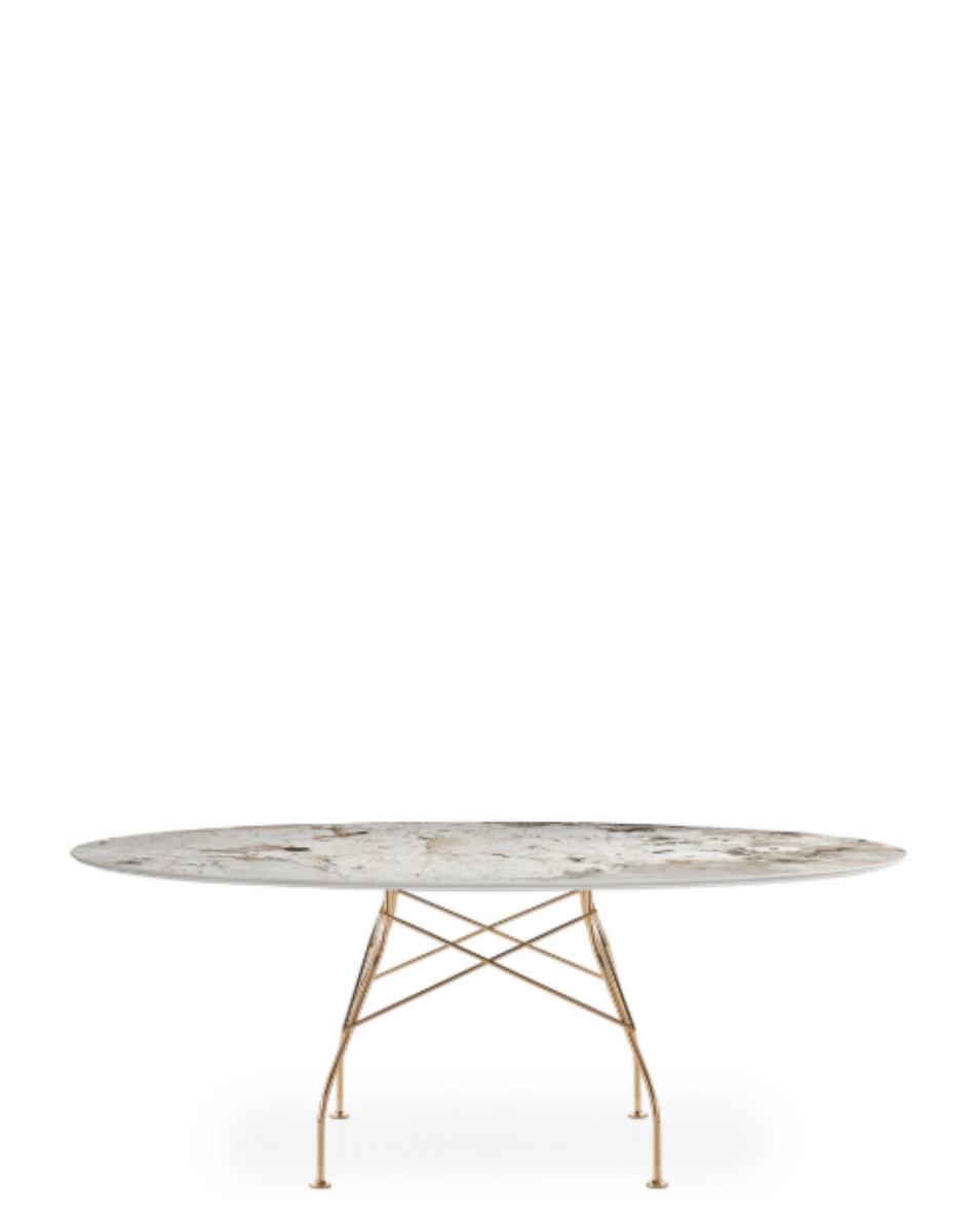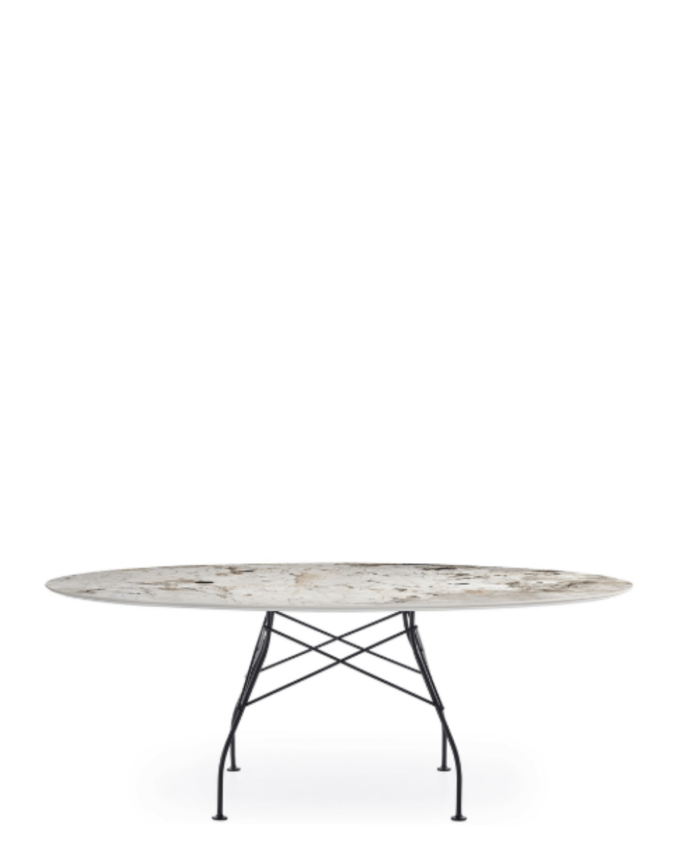 Une table d’exception, associant un plateau en grès effet marbre à une structure légère en acier dotée d’un élégant motif en croix, garantissant stabilité et raffinement.