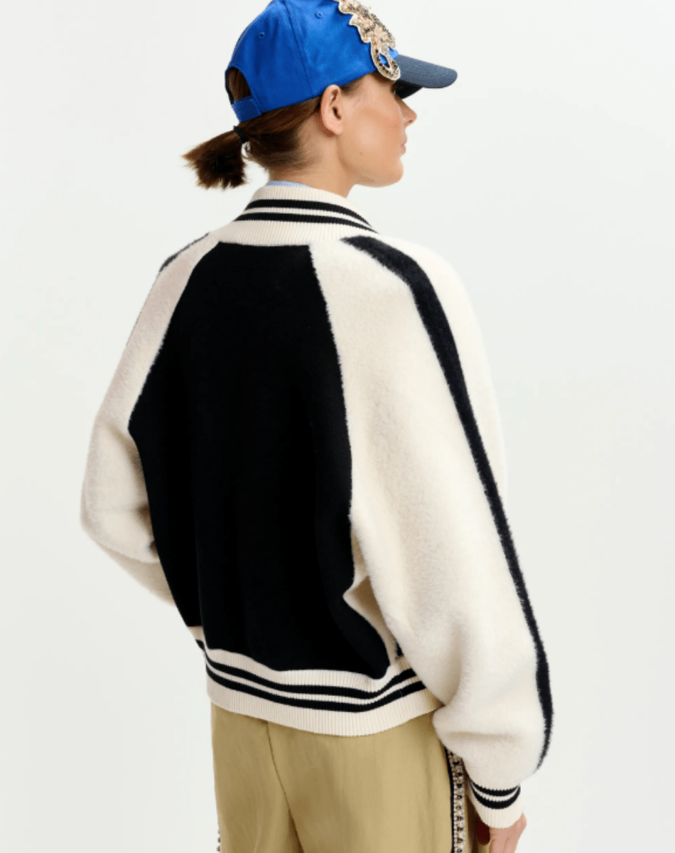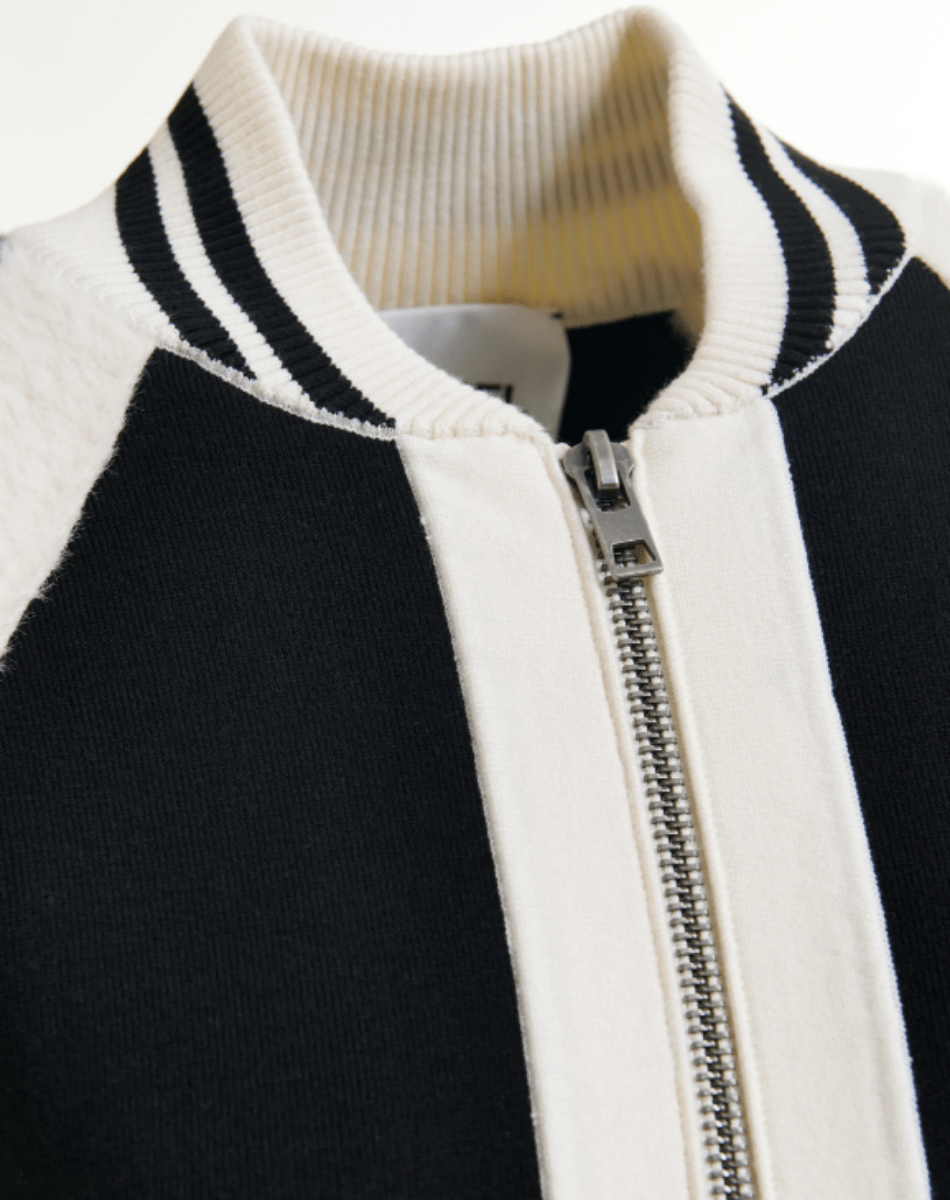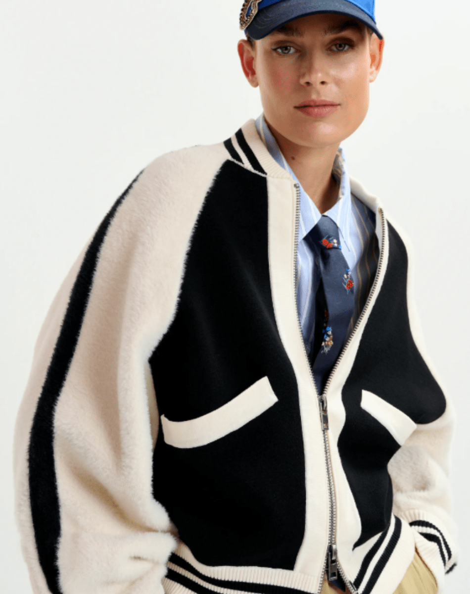 Blouson aviateur en maille fine au toucher doux, rehaussé d’empiècements en fausse fourrure sur le devant et les manches. Sa coupe décontractée et ses épaules raglan offrent une grande liberté de mouvement, tandis que la fermeture zippée frontale assure praticité et style. Les bordures côtelées à rayures viennent compléter la silhouette pour un rendu épuré et moderne.