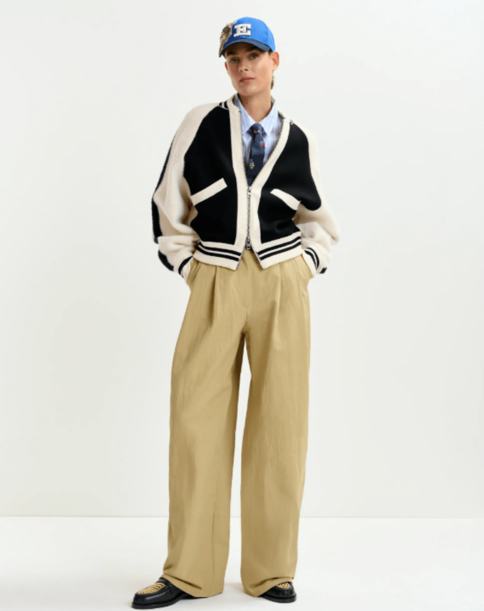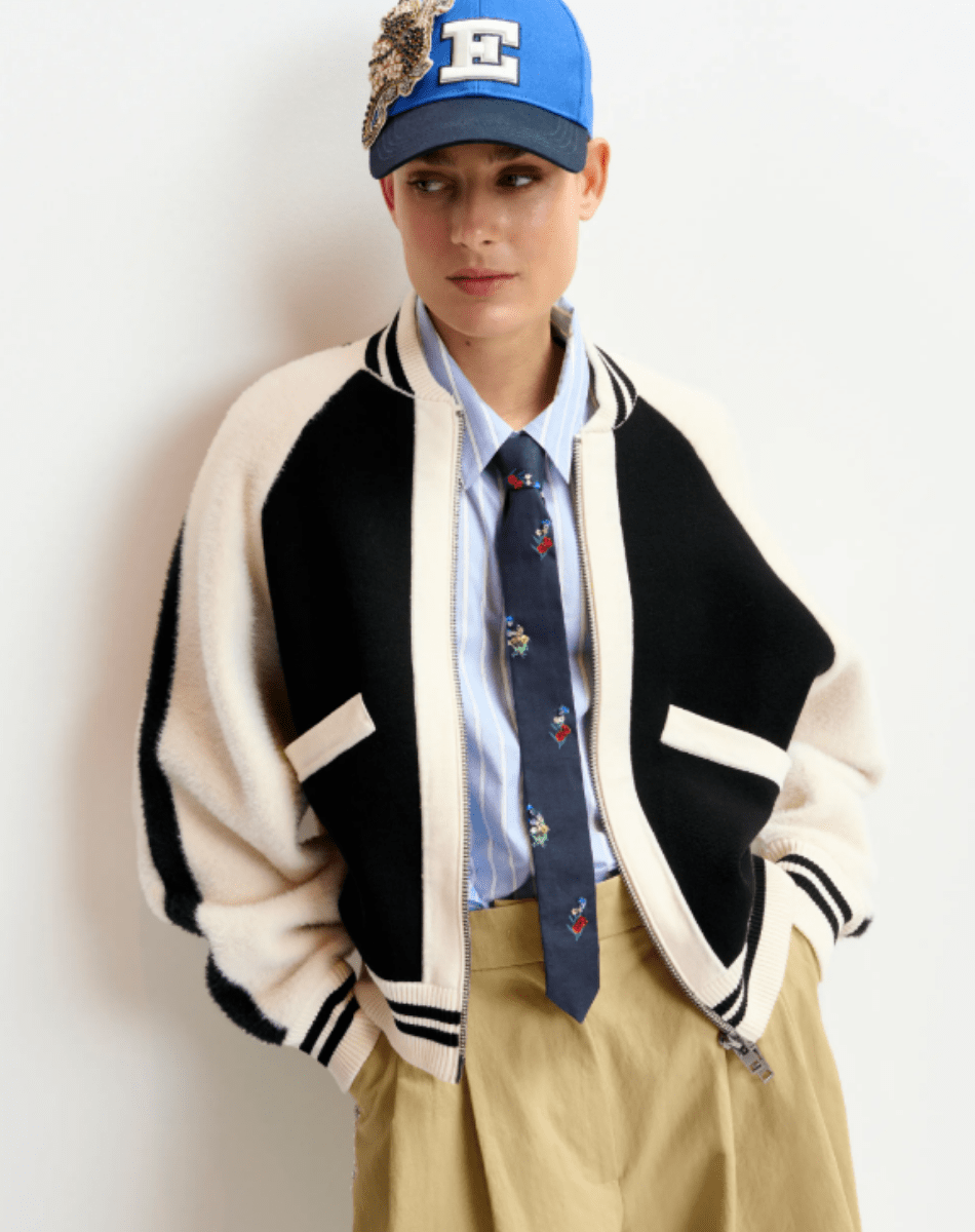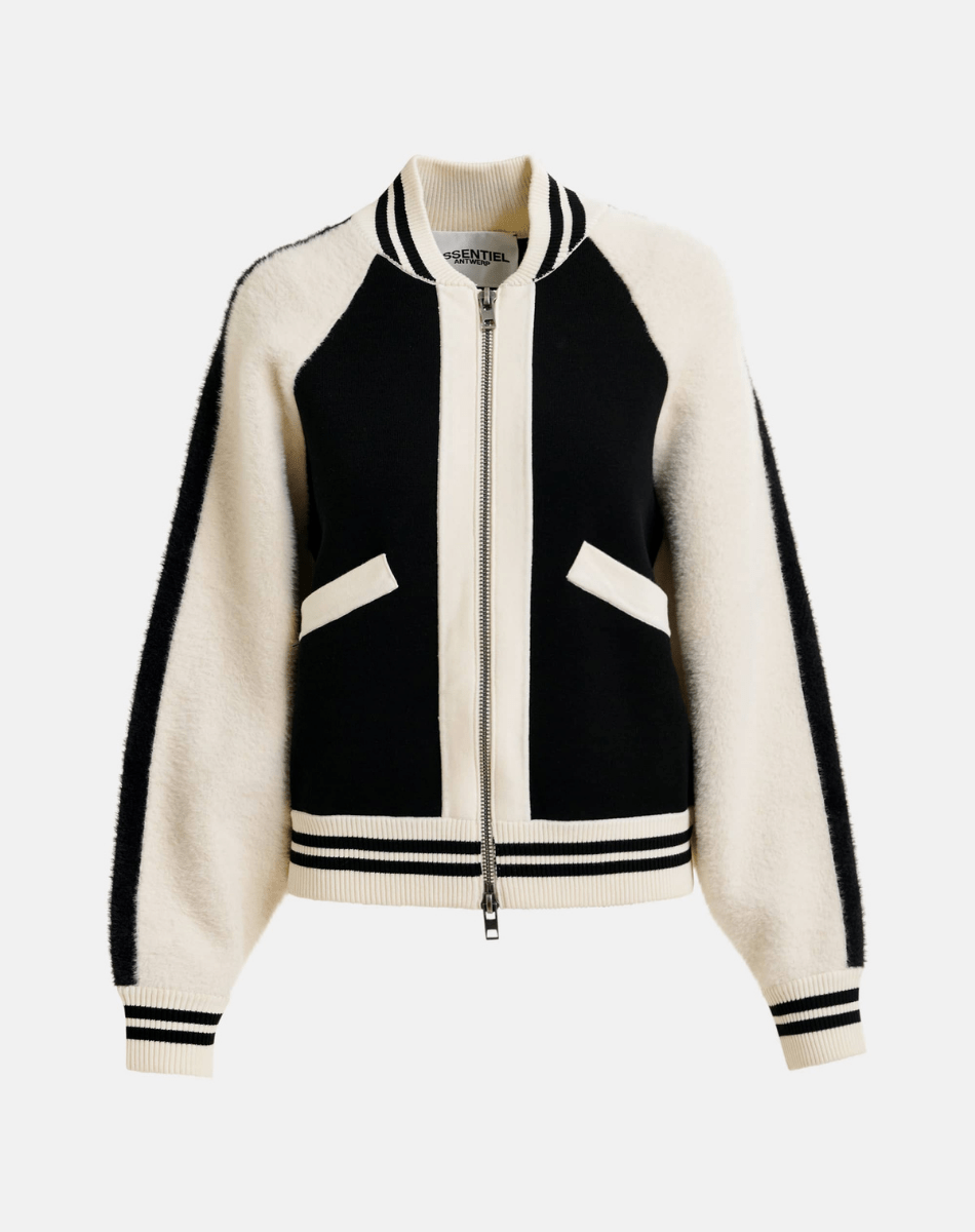 Blouson aviateur en maille fine au toucher doux, rehaussé d’empiècements en fausse fourrure sur le devant et les manches. Sa coupe décontractée et ses épaules raglan offrent une grande liberté de mouvement, tandis que la fermeture zippée frontale assure praticité et style. Les bordures côtelées à rayures viennent compléter la silhouette pour un rendu épuré et moderne.